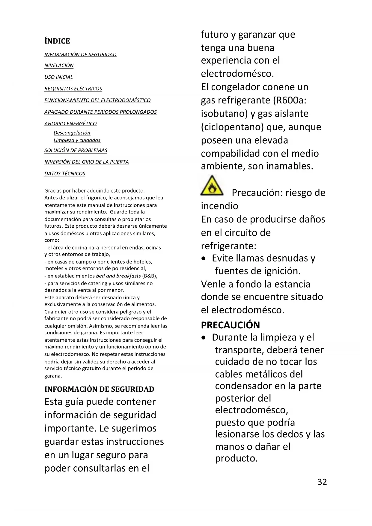Esta guía puede contener información de seguridad importante. Le sugerimos guardar estas instrucciones en un lugar seguro para poder consultarlas en el futuro y garantizar que tenga una buena experiencia con el electrodoméstico. El congelador contiene un gas refrigerante (R600a: isobutano) y gas aislante (ciclopentano) que, aunque poseen una elevada compatibilidad con el medio ambiente, son inflamables. Precaución: riesgo de incendio En caso de producirse daños en el circuito de refrigerante: