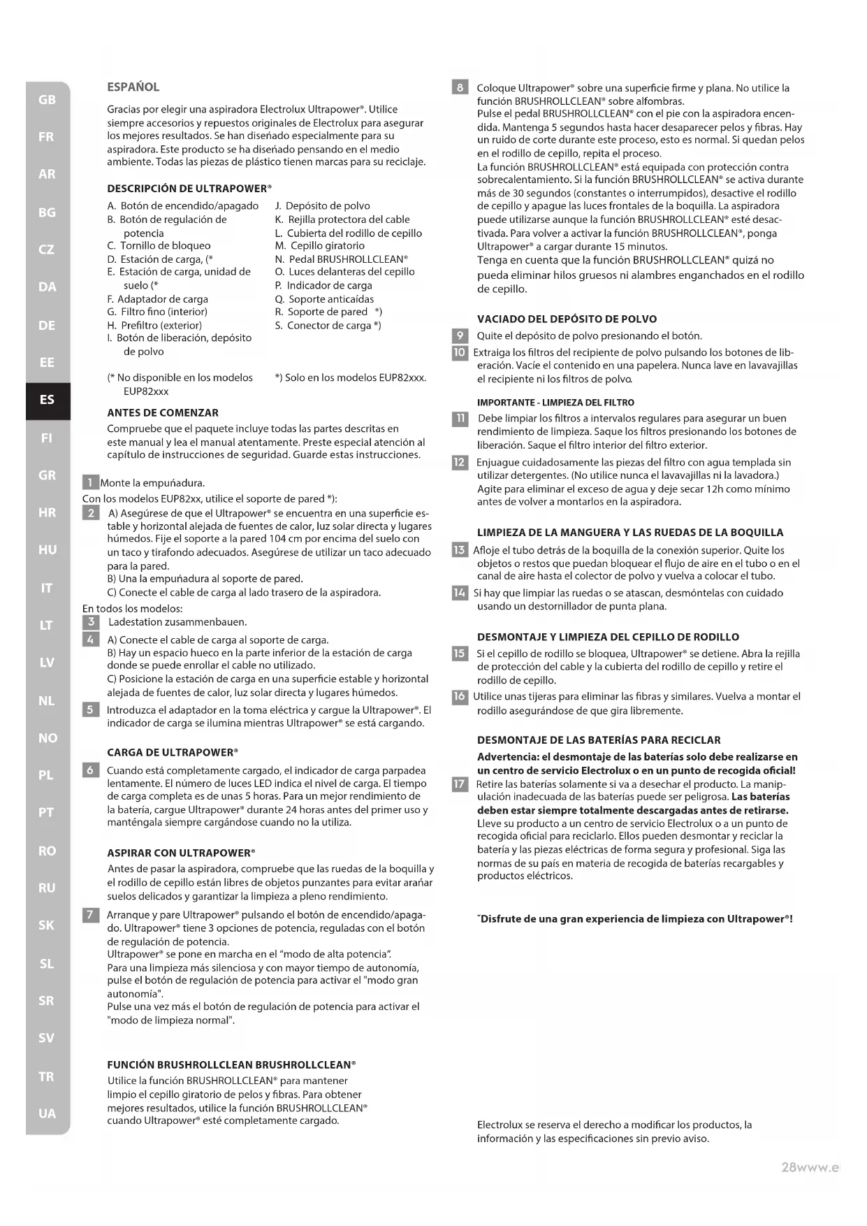 de polvo (* No disponible en los modelos EUP82xxx J. Depósito de polvo K. Rejilla protectora del cable L. Cubierta del rodillo de cepillo M. Cepillo giratorio N. Pedal BRUSHROLLCLEAN® O. Luces delanteras del cepillo P. Indicador de carga Q. Soporte anticaídas R. Soporte de pared *) S. Conector de carga *) *) Solo en los modelos EUP82xxx.
