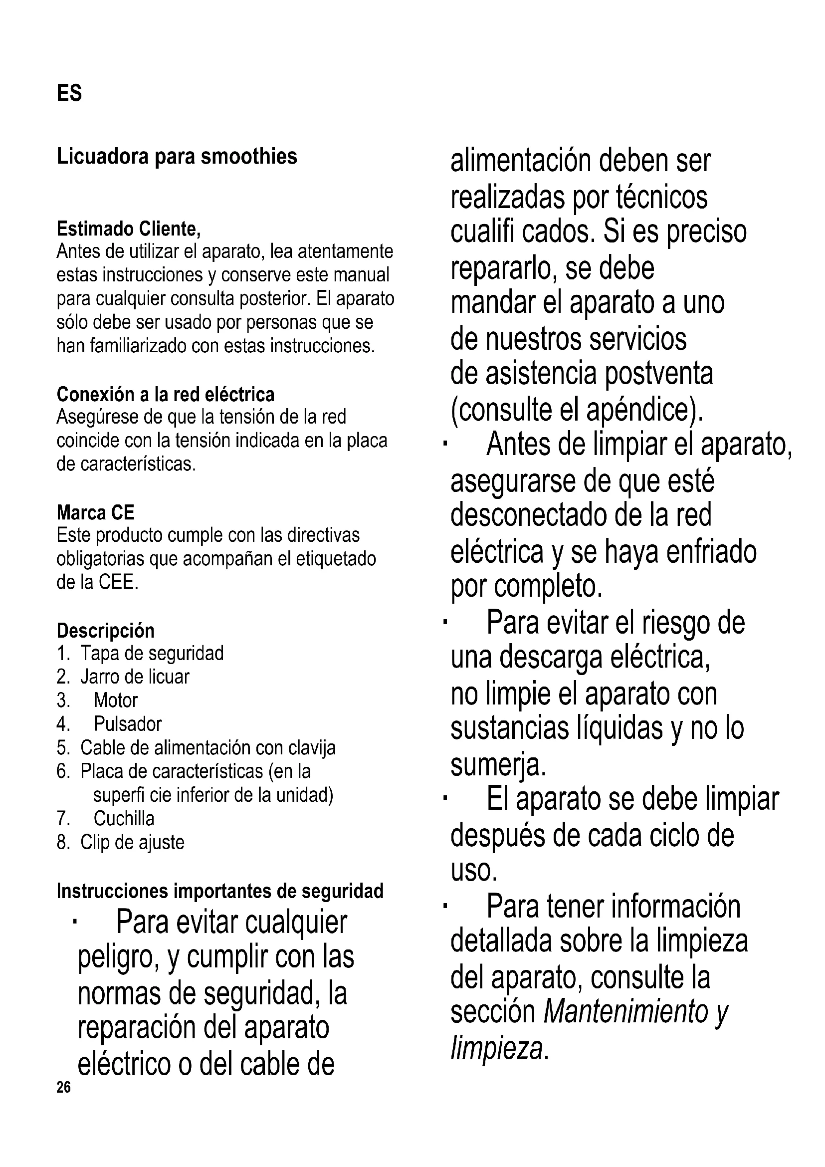 Instrucciones importantes de seguridad ∙ Para evitar cualquier peligro, y cumplir con las normas de seguridad, la reparación del aparato eléctrico o del cable de alimentación deben ser realizadas por técnicos cualifi cados. Si es preciso repararlo, se debe mandar el aparato a uno de nuestros servicios de asistencia postventa (consulte el apéndice). ∙ Antes de limpiar el aparato, asegurarse de que esté desconectado de la red eléctrica y se haya enfriado por completo. ∙ Para evitar el riesgo de una descarga eléctrica, no limpie el aparato con sustancias líquidas y no lo sumerja. ∙ El aparato se debe limpiar después de cada ciclo de uso. ∙ Para tener información detallada sobre la limpieza del aparato, consulte la sección Mantenimiento y limpieza. ES27 ∙ Aviso: La cuchilla está muy afi lada. Para evitar lesiones, tenga mucho cuidado al vaciar el jarro o limpiar el aparato. ∙ Precaución: No llene el jarro con ingredientes calientes. ∙ Extreme las precauciones al añadir líquidos calientes por si se desprende vapor del aparato. ∙ Precaución: El uso incorrecto puede provocar lesiones personales graves. ∙ Desenchufe siempre el aparato - antes de montar o desmontar el aparato, - antes de dejar el aparato sin supervisión, - antes de limpiarlo, - después del uso. ∙ Este aparato ha sido diseñado para el uso doméstico u otra aplicación similar, por ejemplo - en cocinas de personal, en ofi cinas y otros puntos comerciales, - en empresas agrícolas, - por los clientes de hoteles, pensiones, etc. y alojamientos similares, - en casas rurales. ∙ El aparato podrá ser utilizado por personas con reducidas facultades físicas, sensoriales o mentales, o sin experiencia ni conocimiento del producto, solo cuando hayan recibido la supervisión o instrucciones referentes al uso del aparato y entiendan por completo todo el peligro y las precauciones de seguridad. ∙ No se debe permitir que los niños utilicen el aparato. El aparato y su cable eléctrico se deben mantener fuera28 del alcance de los niños. ∙ Los niños no deben jugar con el aparato. ∙ Precaución: Mantenga a los niños alejados del material de embalaje, porque podría ser peligroso, existe el peligro de asfi xia. ∙ Antes de utilizar el aparato, siempre se debe comprobar que tanto la unidad principal, el cable de alimentación como cualquier accesorio no están defectuosos. En caso de que el aparato haya caído sobre una superfi cie dura, o se haya tirado en exceso del cable de alimentación, no se deberá utilizar de nuevo: incluso los desperfectos no visibles pueden tener efectos adversos sobre la seguridad en el uso del aparato. ∙ El aparato sólo debe colocarse sobre una superfi cie nivelada. No deje que la carcasa ni el cable entren en contacto con llamas ni con ninguna superfi cie caliente tales como platos muy calientes. ∙ No permita que el cable de conexión cuelgue libremente. ∙ Precaución: La cuchilla se debe ajustar al motor sólo después de haber acoplado el jarro de licuar. ∙ No toque las partes en movimiento, esto puede ser sumamente peligroso. ∙ Cuando se desenchufa la clavija de la pared, nunca tirar del cable de alimentación; sino asir siempre la clavija misma. ∙ No se acepta responsabilidad alguna si hay averías a consecuencia del uso incorrecto del aparato o si estas instrucciones no han sido observadas debidamente. Jarro de licuar ∙ Para cerrar el jarro después de licuar los ingredientes, enrosque la tapa hasta ajustarla. De este modo, el smoothie preparado se puede guardar o transportar. ∙ Al abrir el clip de ajuste, el smoothie se puede servir directamente desde el jarro. ∙ Para facilitar su conservación, la tapa se puede encajar en la base del jarro. Antes usarlo por primera vez Antes de usar el aparato por primera vez, el jarro y la cuchilla se deben limpiar a fondo, tal y como se describe en la sección Mantenimiento y limpieza. Funcionamiento de corta duración El aparato está diseñado para procesar cantidades normales domésticas de comida; puede funcionar sin interrupción durante 1 minuto como máximo, después de este tiempo deberá esperar hasta que se enfríe a temperatura ambiente. Interruptor de seguridad El interruptor especial del motor garantiza que el aparato sólo se puede activar después de acoplar correctamente el jarro de licuar.29 Funcionamiento ∙ Corte los ingredientes en dados de aproximadamente 15mm e introdúzcalos en el jarro de licuar. ∙ Para obtener el resultado óptimo, introduzca los ingredientes en el jarro según esta secuencia: