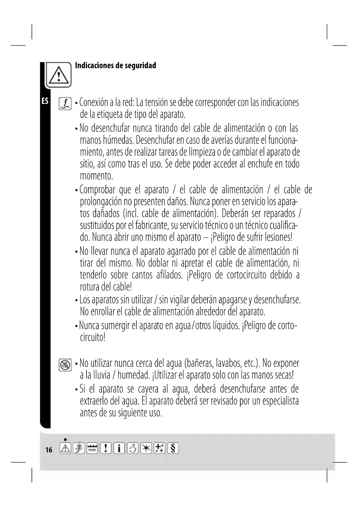 - No utilizar nunca cerca del agua (bañeras, lavabos, etc.). No exponer a la lluvia / humedad. ¡Utilizar el aparato solo con las manos secas!17 Indicaciones de seguridad