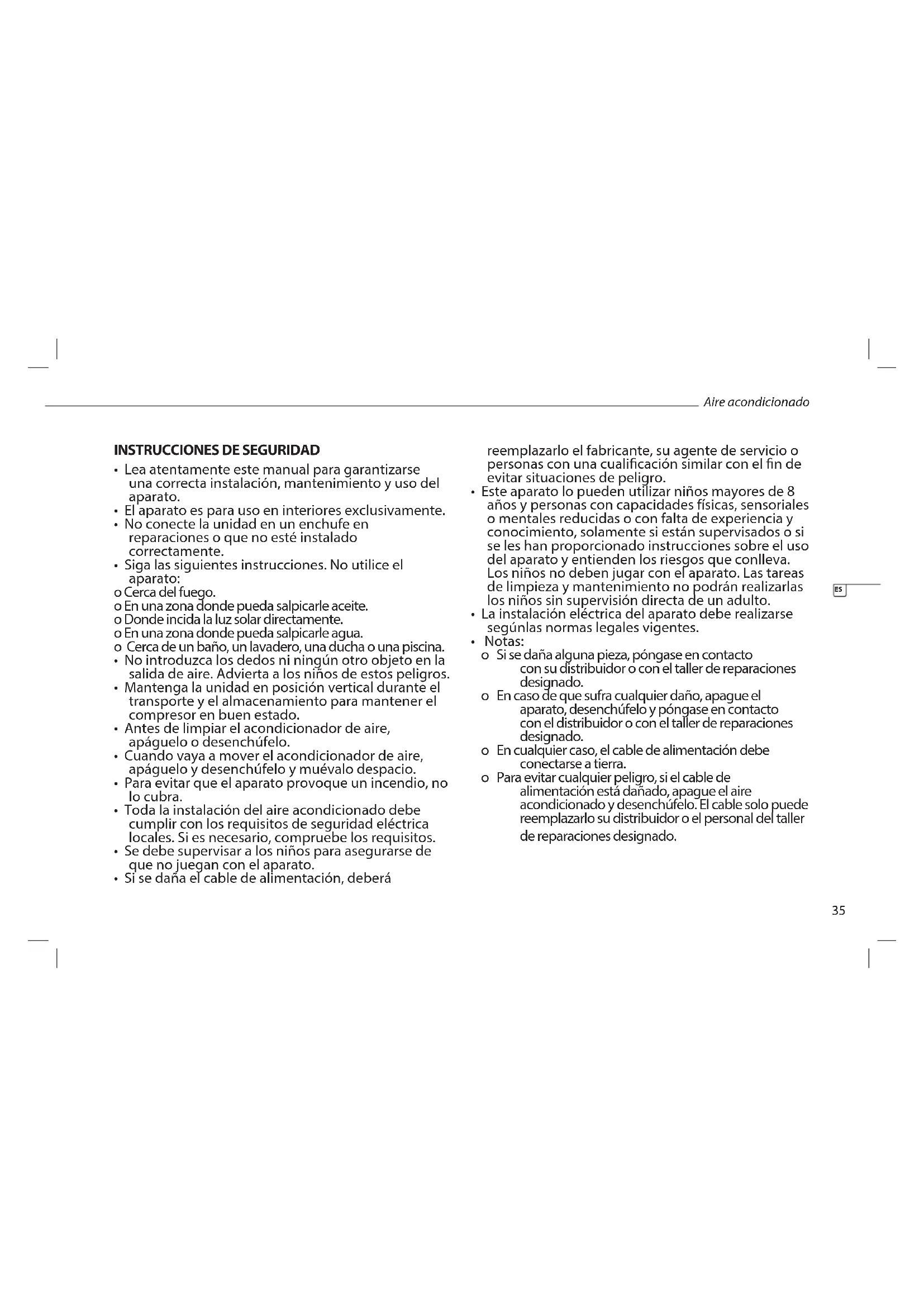 - Notas: o Si se daña alguna pieza, póngase en contacto con su distribuidor o con el taller de reparaciones designado. o En caso de que sufra cualquier daño, apague el aparato, desenchúfelo y póngase en contacto con el distribuidor o con el taller de reparaciones designado. o En cualquier caso, el cable de alimentación debe conectarse a tierra. o Para evitar cualquier peligro, si el cable de alimentación está dañado, apague el aire acondicionado y desenchúfelo. El cable solo puede reemplazarlo su distribuidor o el personal del taller de reparaciones designado. ES36 ADVERTENCIA