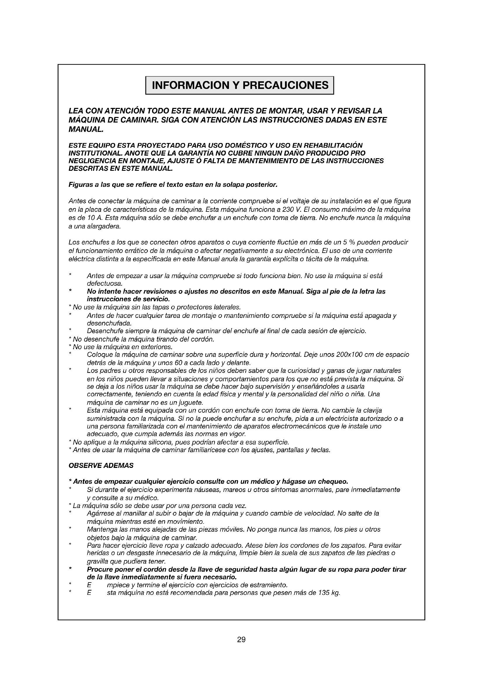LEA CON ATENCIÓN TODO ESTE MANUAL ANTES DE MONTAR, USAR Y REVISAR LA MÁQUINA DE CAMINAR. SIGA CON ATENCIÓN LAS INSTRUCCIONES DADAS EN ESTE MANUAL. ESTE EQUIPO ESTA PROYECTADO PARA USO DOMÉSTICO Y USO EN REHABILITACIÓN INSTITUTIONAL. ANOTE QUE LA GARANTÍA NO CUBRE NINGUN DAÑO PRODUCIDO PRO NEGLIGENCIA EN MONTAJE, AJUSTE Ó FALTA DE MANTENIMIENTO DE LAS INSTRUCCIONES DESCRITAS EN ESTE MANUAL. Figuras a las que se refiere el texto estan en la solapa posterior. Antes de conectar la máquina de caminar a la corriente compruebe si el voltaje de su instalación es el que figura en la placa de características de la máquina. Esta máquina funciona a 230 V. El consumo máximo de la máquina es de 10 A. Esta máquina sólo se debe enchufar a un enchufe con toma de tierra. No enchufe nunca la máquina a una alargadera. Los enchufes a los que se conecten otros aparatos o cuya corriente fluctúe en más de un 5 % pueden producir el funcionamiento errático de la máquina o afectar negativamente a su electrónica. El uso de una corriente eléctrica distinta a la especificada en este Manual anula la garantía explícita o tácita de la máquina.
