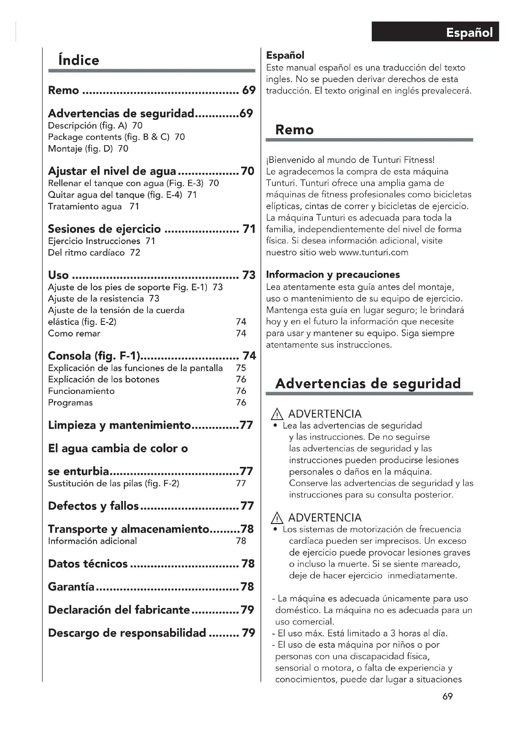 - Los sistemas de motorización de frecuencia cardíaca pueden ser imprecisos. Un exceso de ejercicio puede provocar lesiones graves o incluso la muerte. Si se siente mareado, deje de hacer ejercicio inmediatamente. - La máquina es adecuada únicamente para uso doméstico. La máquina no es adecuada para un uso comercial. - El uso máx. Está limitado a 3 horas al día. - El uso de esta máquina por niños o por personas con una discapacidad física, sensorial o motora, o falta de experiencia y conocimientos, puede dar lugar a situaciones Índice Remo .............................................. 69 Advertencias de seguridad ............. 69 Descripción (g. A) 70 Package contents (g. B & C) 70 Montaje (g. D) 70 Ajustar el nivel de agua .................. 70 Rellenar el tanque con agua (Fig. E-3) 70 Quitar agua del tanque (g. E-4) 71 Tratamiento agua 71 Sesiones de ejercicio ...................... 71 Ejercicio Instrucciones 71 Del ritmo cardíaco 72 Uso ................................................. 73 Ajuste de los pies de soporte Fig. E-1) 73 Ajuste de la resistencia 73 Ajuste de la tensión de la cuerda elástica (g. E-2) 74 Como remar 74 Consola (g. F-1)............................. 74 Explicación de las funciones de la pantalla 75 Explicación de los botones 76 Funcionamiento 76 Programas 76 Limpieza y mantenimiento .............. 77 El agua cambia de color o se enturbia ...................................... 77 Sustitución de las pilas (g. F-2) 77 Defectos y fallos ............................. 77 Transporte y almacenamiento ......... 78 Información adicional 78 Datos técnicos ................................ 78 Garantía .......................................... 78 Declaración del fabricante .............. 79 Descargo de responsabilidad ......... 7970 Español de riesgo. Las personas responsables de su seguridad deben dar instrucciones explícitas o supervisar el uso de la máquina. - Antes de empezar a hacer ejercicio, consulte con un médico para comprobar su estado de salud. - Si experimenta nauseas, mareos u otros síntomas anormales, deje de hacer ejercicio inmediatamente y consulte con un médico. - Para evitar dolor y tensión muscular, realice un calentamiento antes de empezar a hacer ejercicio y termine haciendo relajación. Recuerde hacer estiramientos al final de la sesión de ejercicio. - La máquina es adecuada únicamente para uso en interior. La máquina no es adecuada para un uso en exterior. - Utilice la máquina únicamente en lugares con una ventilación adecuada. No utilice la máquina en lugares donde haya corriente para no resfriarse. - Utilice la máquina únicamente en lugares con una temperatura ambiente entre 10 °C y 35 °C. Almacene la máquina únicamente en lugares con una temperatura ambiente entre 5 °C y 45 °C. - No utilice ni almacene la máquina en espacios húmedos. La humedad del aire no debe ser superior al 80%. - Utilice la máquina sólo para su uso previsto. No la utilice para otros fines que no sean los descritos en el manual. - La máquina no debe utilizarse si alguna de las piezas ha sufrido daños o tiene algún defecto. Contacte con su proveedor si alguna de las piezas ha sufrido daños o tiene algún defecto. - Mantenga las manos, los pies y demás partes del cuerpo alejadas de las piezas móviles. - Mantenga el pelo alejado de las piezas móviles. - Lleve ropa y calzado adecuado. - Mantenga la ropa, las joyas y otros objetos alejados de las piezas móviles. - Asegúrese de que sólo una persona utilice la máquina cada vez. La máquina no debe ser utilizada por personas cuyo peso supere los 150 kg (330 lbs). - No abra la máquina sin consultar con su proveedor. Descripción (fig. A) El remo es una máquina estacionaria de fitness que se utiliza para simular la acción de remar sin generar una presión excesiva en las articulaciones. Package contents (fig. B & C) - El paquete contiene los elementos que se muestran en la fig. B. - El paquete contiene los elementos de fijación que se muestran en la fig. C. onsulte la sección “Descripción”. ‼ NOTA