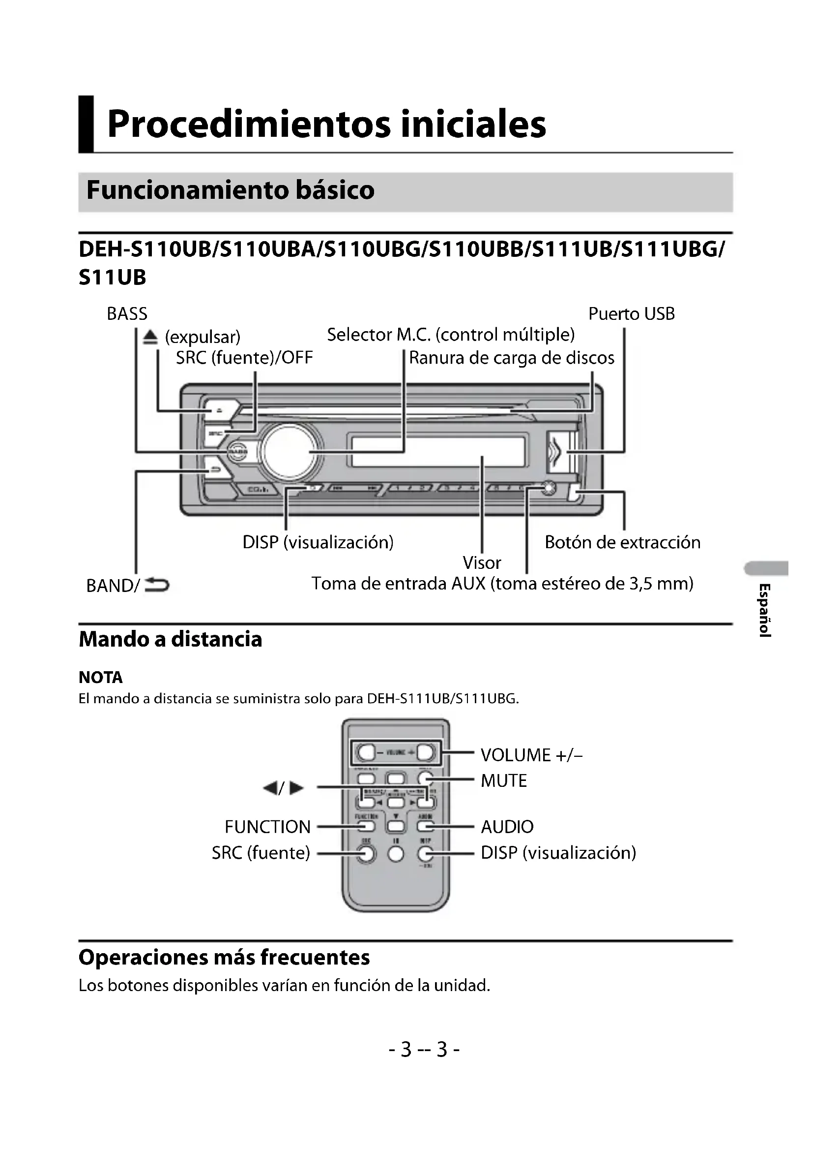 - En las siguientes instrucciones, la designación “dispositivo USB” hace referencia tanto a dispositivos de memoria USB como a reproductores de audio USB. Índice- 3 -- 3 - Español DEH-S110UB/S110UBA/S110UBG/S110UBB/S111UB/S111UBG/ S11UB Mando a distancia NOTA El mando a distancia se suministra solo para DEH-S111UB/S111UBG. Operaciones más frecuentes Los botones disponibles varían en función de la unidad. Procedimientos iniciales Funcionamiento básico Botón de extracción Visor Selector M.C. (control múltiple) BAND/ Puerto USB Toma de entrada AUX (toma estéreo de 3,5 mm) (expulsar) Ranura de carga de discos DISP (visualización) BASS SRC (fuente)/OFF