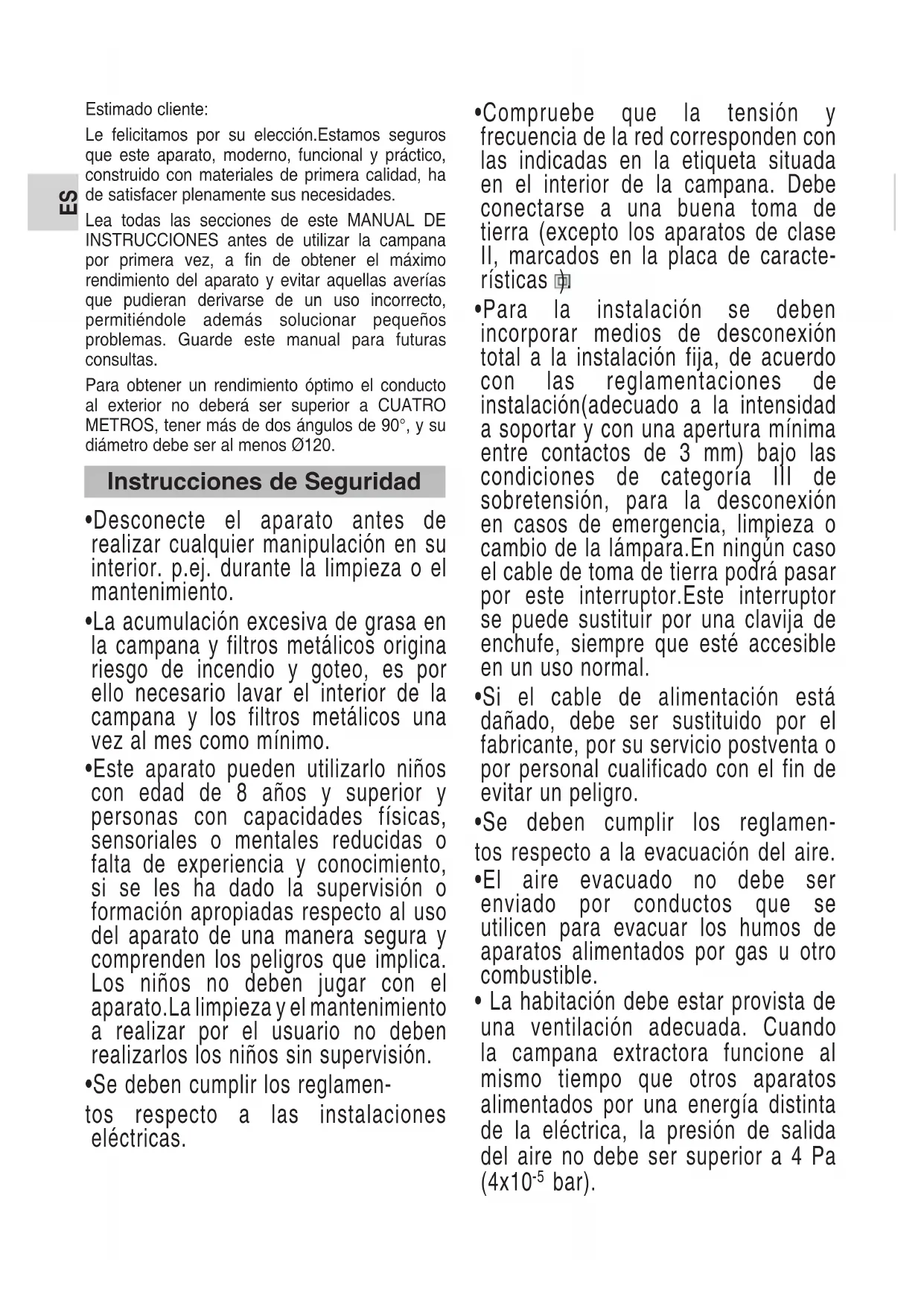 - La habitación debe estar provista de una ventilación adecuada. Cuando la campana extractora funcione al mismo tiempo que otros aparatos alimentados por una energía distinta de la eléctrica, la presión de salida del aire no debe ser superior a 4 Pa (4x10