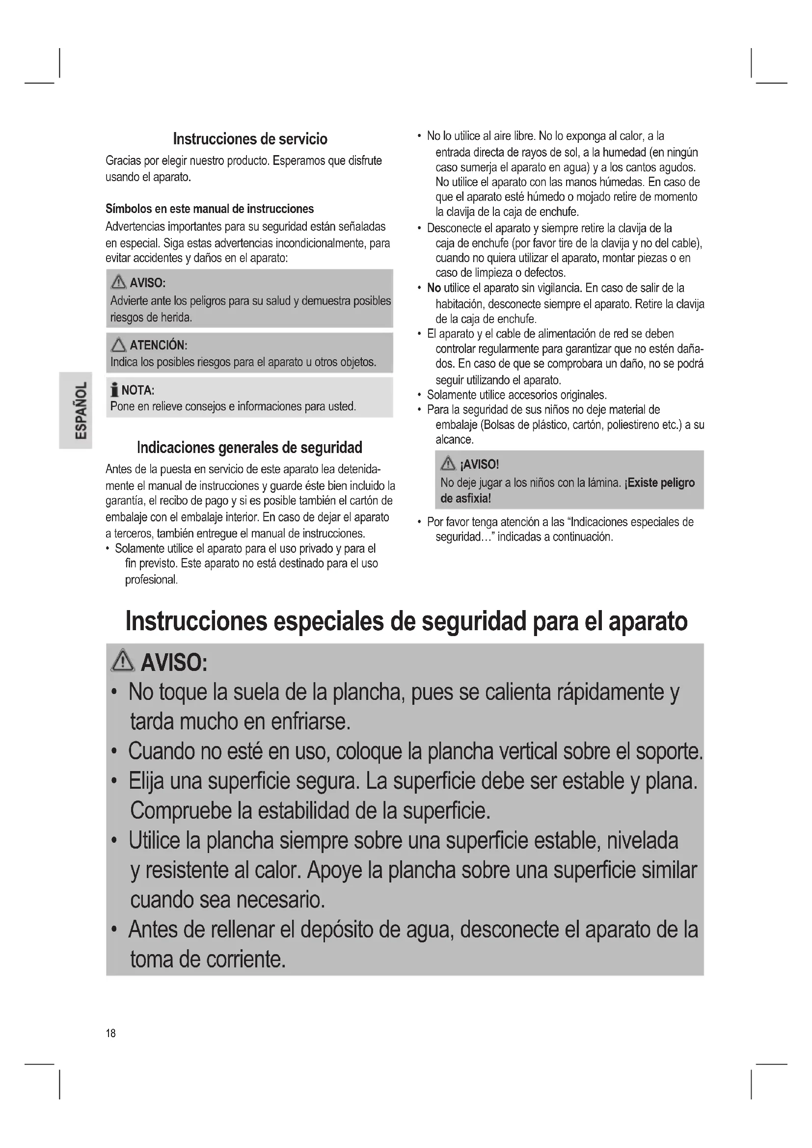 - Por favor tenga atención a las “Indicaciones especiales de seguridad…” indicadas a continuación. Instrucciones de servicio Gracias por elegir nuestro producto. Esperamos que disfrute usando el aparato. Símbolos en este manual de instrucciones Advertencias importantes para su seguridad están señaladas en especial. Siga estas advertencias incondicionalmente, para evitar accidentes y daños en el aparato: AVISO: Advierte ante los peligros para su salud y demuestra posibles riesgos de herida. ATENCIÓN: Indica los posibles riesgos para el aparato u otros objetos. NOTA: Pone en relieve consejos e informaciones para usted. Indicaciones generales de seguridad Antes de la puesta en servicio de este aparato lea detenida- mente el manual de instrucciones y guarde éste bien incluido la garantía, el recibo de pago y si es posible también el cartón de embalaje con el embalaje interior. En caso de dejar el aparato a terceros, también entregue el manual de instrucciones.