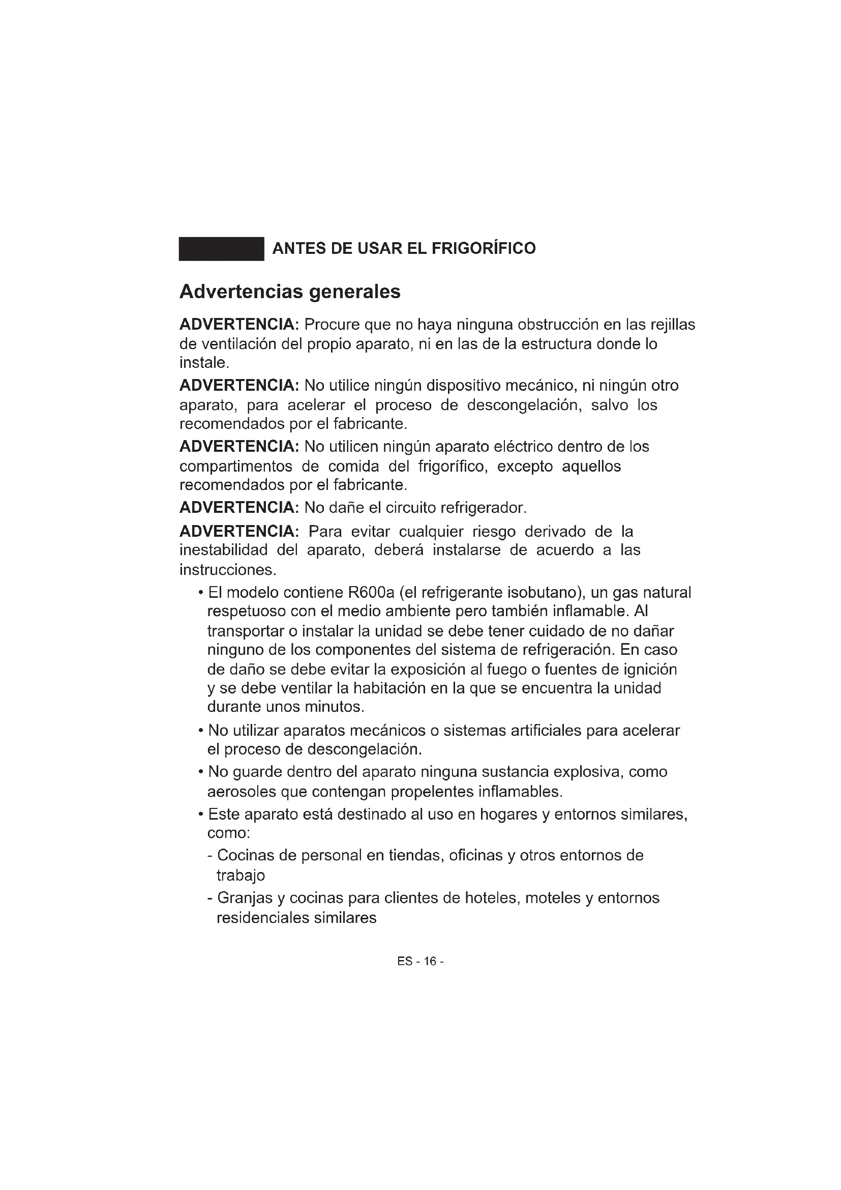 - LOS COMPONENTES DEL APARATO Y COMPARTIMENTOS ES - 16 - ANTES DE USAR EL FRIGORÍFICO PARTE -1. Advertencias generales ADVERTENCIA: Procure que no haya ninguna obstrucción en las rejillas de ventilación del propio aparato, ni en las de la estructura donde lo instale. ADVERTENCIA: No utilice ningún dispositivo mecánico, ni ningún otro aparato, para acelerar el proceso de descongelación, salvo los recomendados por el fabricante. ADVERTENCIA: No utilicen ningún aparato eléctrico dentro de los compartimentos de comida del frigorífico, excepto aquellos recomendados por el fabricante. ADVERTENCIA: No dañe el circuito refrigerador. ADVERTENCIA: Para evitar cualquier riesgo derivado de la inestabilidad del aparato, deberá instalarse de acuerdo a las instrucciones. p. 28