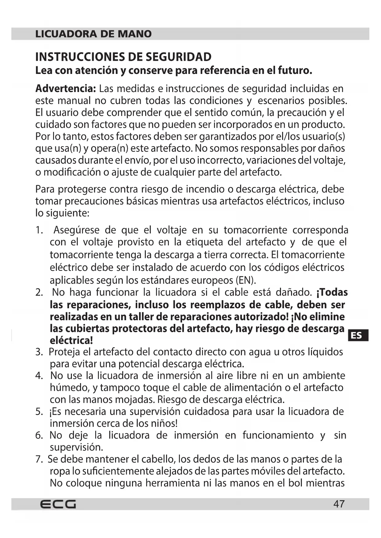 provistas en este manual. Esta licuadora de inmersión está diseñada solo para uso doméstico. El fabricante no es responsable por daños causados por el uso inapropiado de este artefacto.