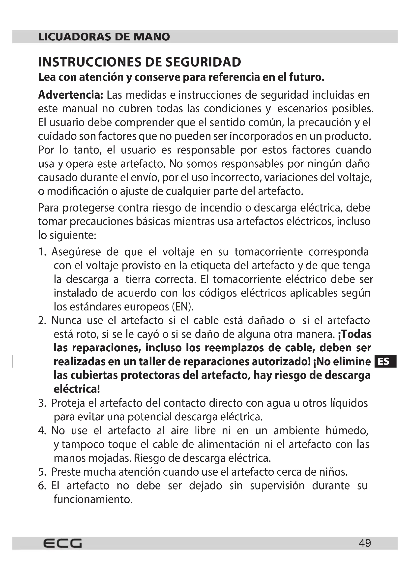 Lea con atención yconserve para referencia en el futuro. Advertencia: Las medidas einstrucciones de seguridad incluidas en este manual no cubren todas las condiciones y escenarios posibles. El usuario debe comprender que el sentido común, la precaución yel cuidado son factores que no pueden ser incorporados en un producto. Por lo tanto, el usuario es responsable por estos factores cuando usa yopera este artefacto. No somos responsables por ningún daño causado durante el envío, por el uso incorrecto, variaciones del voltaje, omodicación oajuste de cualquier parte del artefacto. Para protegerse contra riesgo de incendio odescarga eléctrica, debe tomar precauciones básicas mientras usa artefactos eléctricos, incluso lo siguiente: