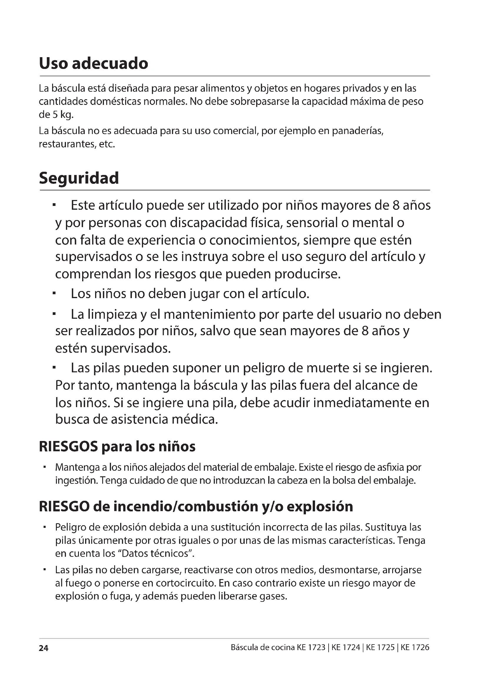 La báscula está diseñada para pesar alimentos y objetos en hogares privados y en las cantidades domésticas normales. No debe sobrepasarse la capacidad máxima de peso de 5 kg.