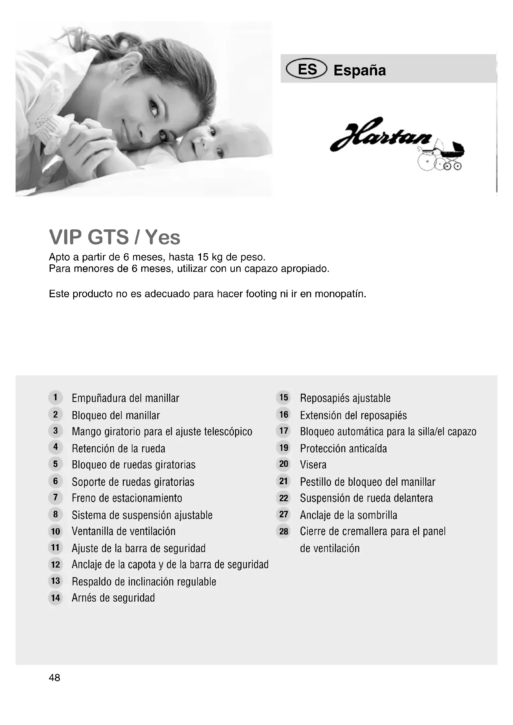 VIP GTS / Yes Apto a partir de 6 meses, hasta 15 kg de peso. Para menores de 6 meses, utilizar con un capazo apropiado. Este producto no es adecuado para hacer footing ni ir en monopatín.