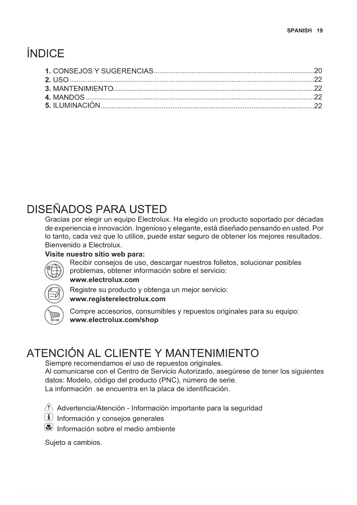Siempre recomendamos el uso de repuestos originales. Al comunicarse con el Centro de Servicio Autorizado, asegúrese de tener los siguientes datos: Modelo, código del producto (PNC), número de serie. La información se encuentra en la placa de identicación. Advertencia/Atención - Información importante para la seguridad Información y consejos generales Información sobre el medio ambiente Sujeto a cambios.20 www.electrolux.com