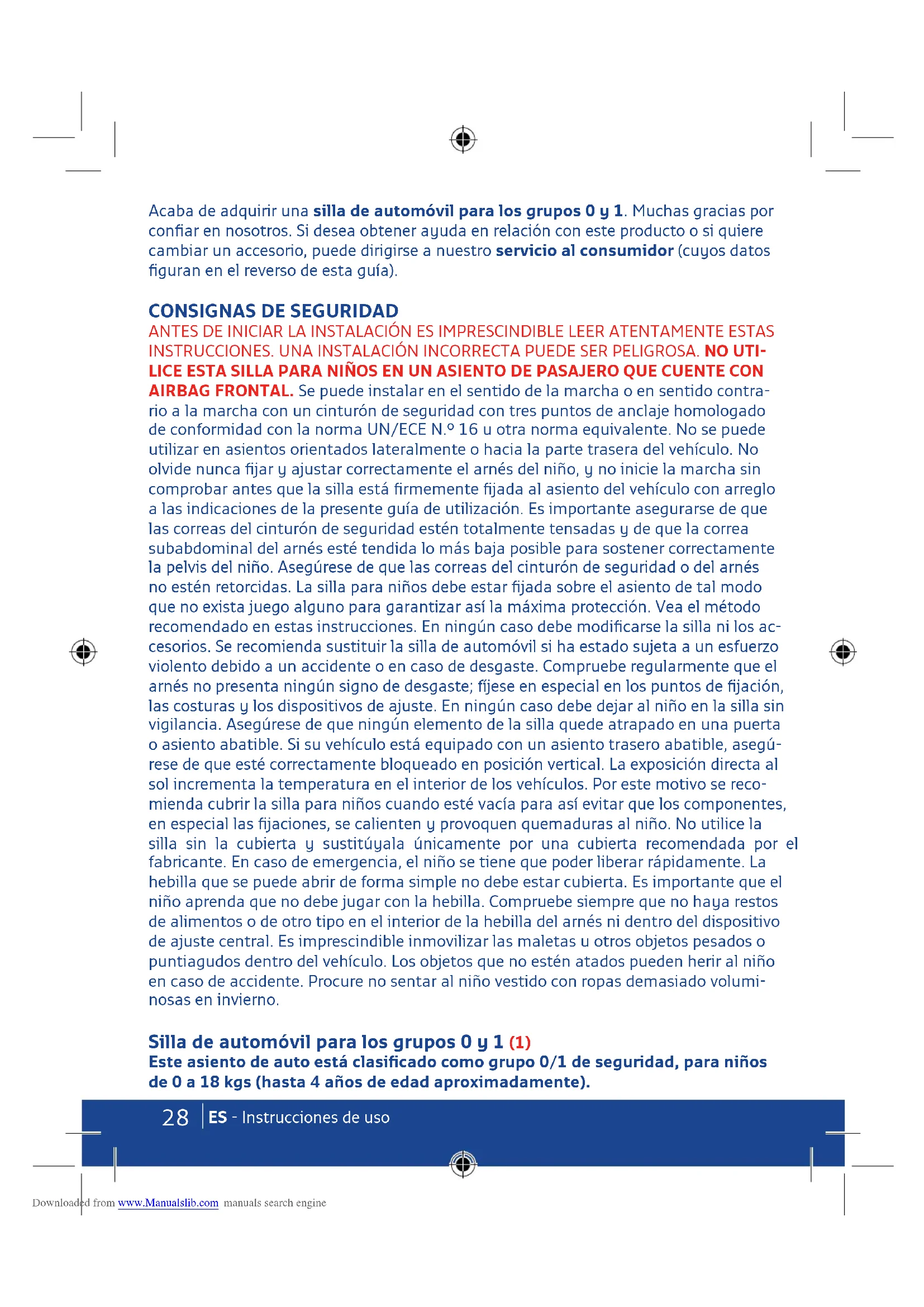 - In caso di dubbi, contattare il fabbricante del dispositivo di ritenuta o il rivenditore. Downloaded from www.Manualslib.com manuals search engine28 ES - Instrucciones de uso Acaba de adquirir una silla de automóvil para los grupos 0 y 1. Muchas gracias por confiar en nosotros. Si desea obtener ayuda en relación con este producto o si quiere cambiar un accesorio, puede dirigirse a nuestro servicio al consumidor (cuyos datos figuran en el reverso de esta guía).