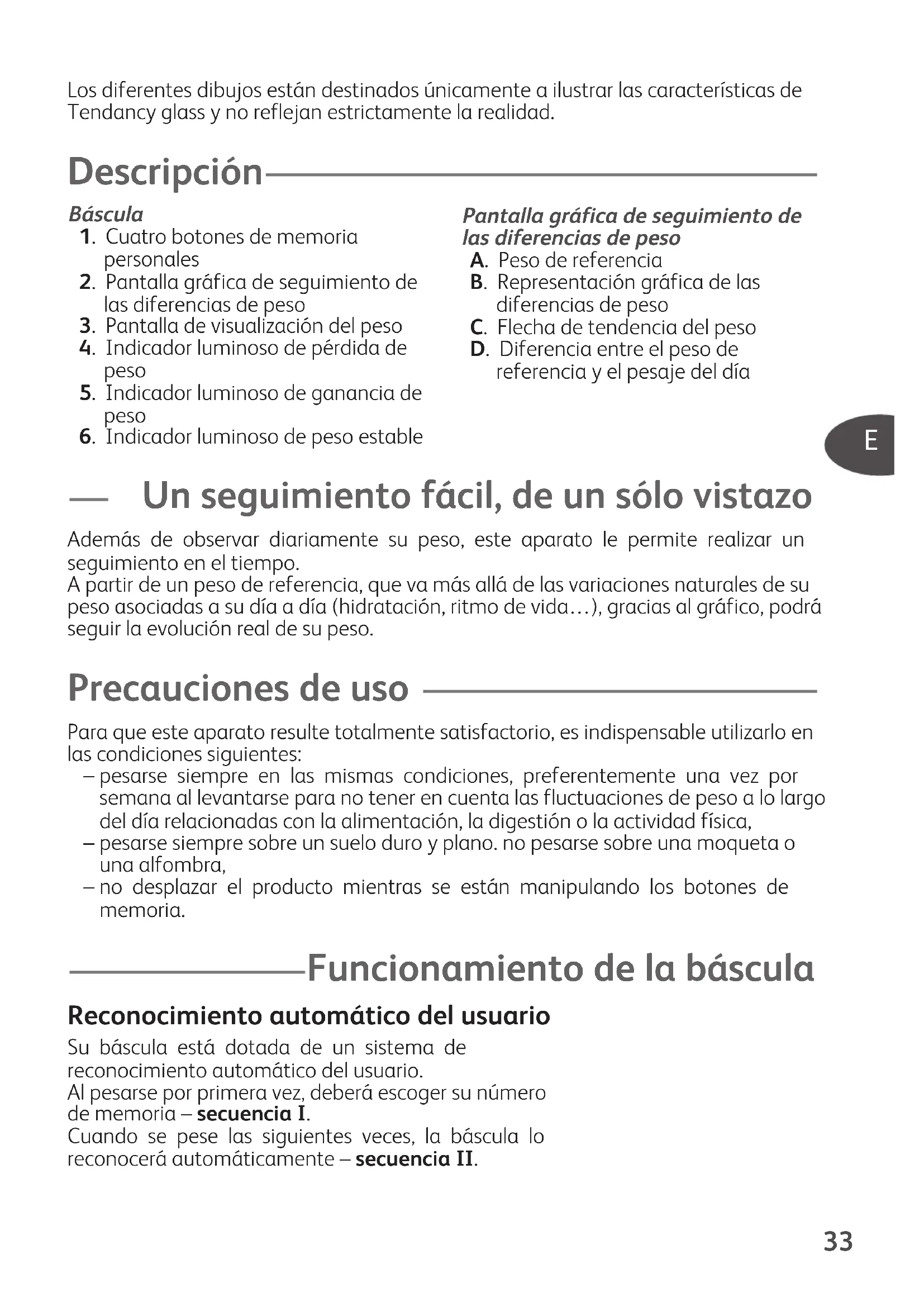 Un seguimiento fácil, de un sólo vistazo Además de observar diariamente su peso, este aparato le permite realizar unseguimiento en el tiempo. A partir de un peso de referencia, que va más allá de las variaciones naturales de supeso asociadas a su día a día (hidratación, ritmo de vida…), gracias al gráfico, podráseguir la evolución real de su peso. Precauciones de uso Para que este aparato resulte totalmente satisfactorio, es indispensable utilizarlo enlas condiciones siguientes:– pesarse siempre en las mismas condiciones, preferentemente una vez porsemana al levantarse para no tener en cuenta las fluctuaciones de peso a lo largodel día relacionadas con la alimentación, la digestión o la actividad física,– pesarse siempre sobre un suelo duro y plano. no pesarse sobre una moqueta ouna alfombra,– no desplazar el producto mientras se están manipulando los botones dememoria. Funcionamiento de la báscula Reconocimiento automático del usuario Su báscula está dotada de un sistema dereconocimiento automático del usuario.Al pesarse por primera vez, deberá escoger su númerode memoria – secuencia I.Cuando se pese las siguientes veces, la báscula loreconocerá automáticamente – secuencia II.Pantalla gráfica de seguimiento delas diferencias de pesoA. Peso de referenciaB. Representación gráfica de lasdiferencias de pesoC. Flecha de tendencia del pesoD. Diferencia entre el peso dereferencia y el pesaje del díaF