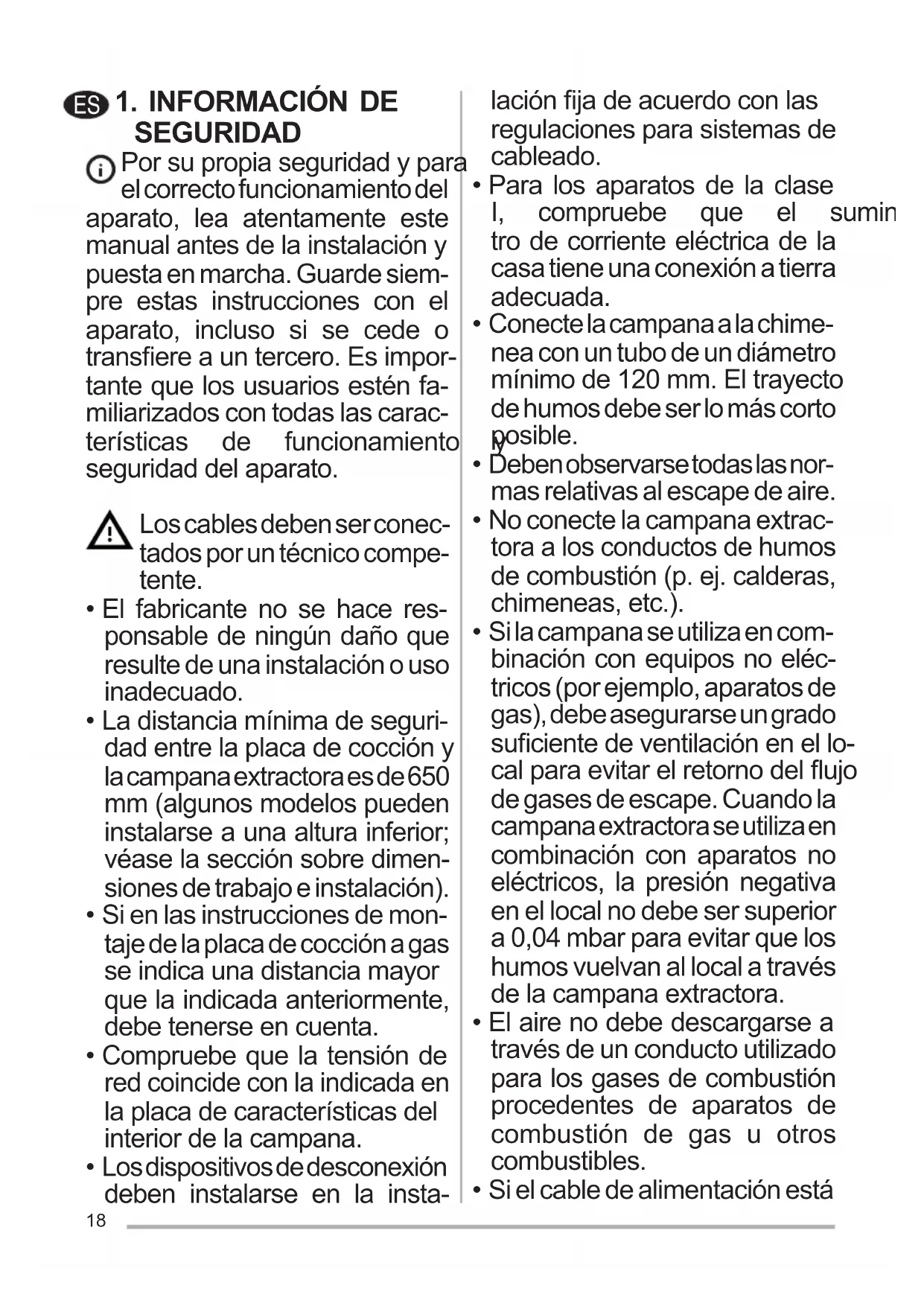 SEGURIDAD Porsupropiaseguridadypara el correcto funcionamiento del aparato, lea atentamente este manualantesdelainstalacióny puesta en marcha. Guarde siem- pre estas instrucciones con el aparato, incluso si se cede o transereauntercero.Esimpor- tante que los usuarios estén fa- miliarizados con todas las carac- terísticas de funcionamiento y seguridad del aparato. Los cables deben ser conec- tados por un técnico compe- tente.
