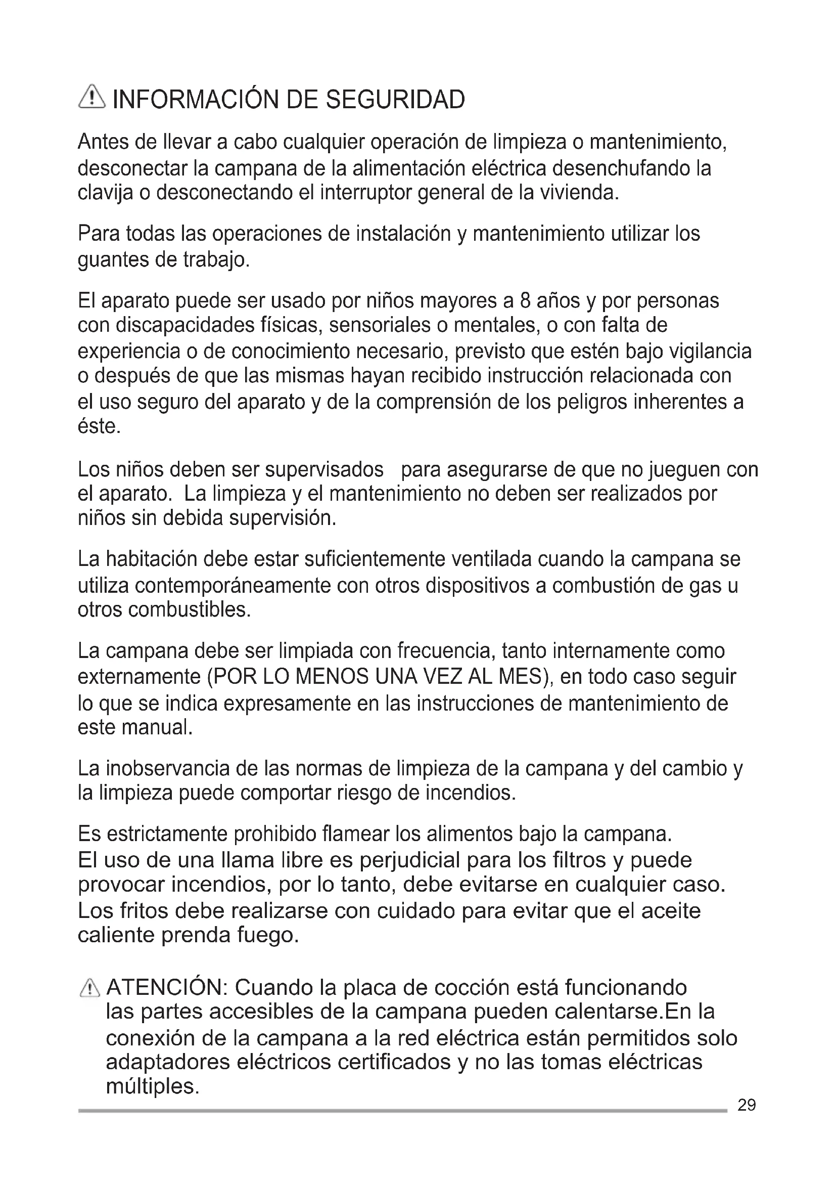 Antesdellevaracabocualquieroperacióndelimpiezaomantenimiento, desconectar la campana de la alimentación eléctrica desenchufando la clavijaodesconectandoelinterruptorgeneraldelavivienda. Paratodaslasoperacionesdeinstalaciónymantenimientoutilizarlos guantesdetrabajo. Elaparatopuedeserusadoporniñosmayoresa8añosyporpersonas condiscapacidadesfísicas,sensorialesomentales,oconfaltade experienciaodeconocimientonecesario,previstoqueesténbajovigilancia odespuésdequelasmismashayanrecibidoinstrucciónrelacionadacon elusosegurodelaparatoydelacomprensióndelospeligrosinherentesa éste. Los niños deben ser supervisados para asegurarse de que no jueguen con elaparato.Lalimpiezayelmantenimientonodebenserrealizadospor niñossindebidasupervisión. Lahabitacióndebeestarsucientementeventiladacuandolacampanase utiliza contemporáneamente con otros dispositivos a combustión de gas u otroscombustibles. Lacampanadebeserlimpiadaconfrecuencia,tantointernamentecomo externamente(PORLOMENOSUNAVEZALMES),entodocasoseguir lo que se indica expresamente en las instrucciones de mantenimiento de estemanual. Lainobservanciadelasnormasdelimpiezadelacampanaydelcambioy lalimpiezapuedecomportarriesgodeincendios. Esestrictamenteprohibidoamearlosalimentosbajolacampana. Elusodeunallamalibreesperjudicialparalosltrosypuede provocarincendios,porlotanto,debeevitarseencualquiercaso. Los fritos debe realizarse con cuidado para evitar que el aceite calienteprendafuego. ATENCIÓN: Cuando la placa de cocción está funcionando laspartesaccesiblesdelacampanapuedencalentarse.Enla conexión de la campana a la red eléctrica están permitidos solo adaptadoreseléctricoscertificadosynolastomaseléctricas múltiples.30