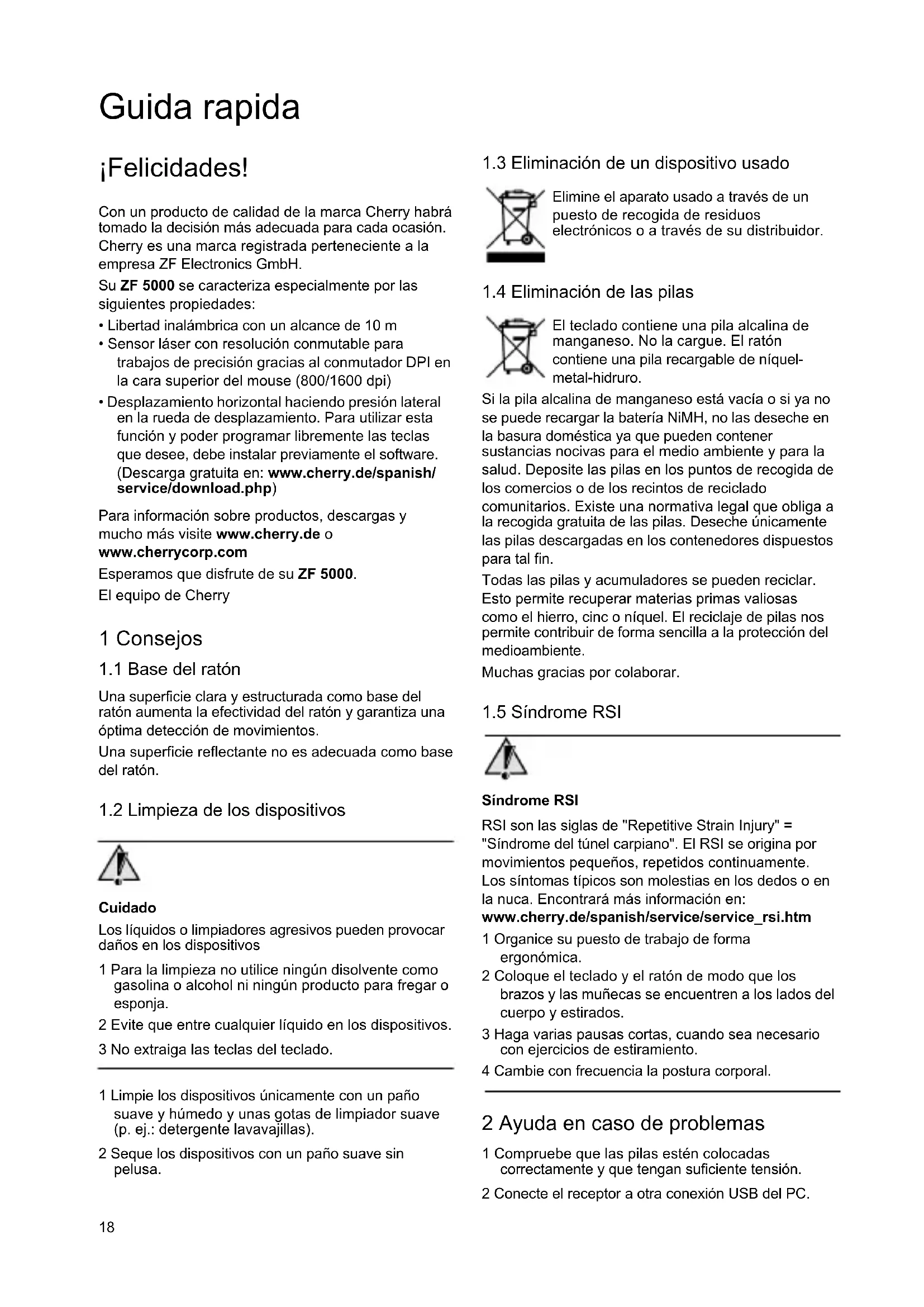 Síndrome RSI RSI son las siglas de "Repetitive Strain Injury" = "Síndrome del túnel carpiano". El RSI se origina por movimientos pequeños, repetidos continuamente. Los síntomas típicos son molestias en los dedos o en la nuca. Encontrará más información en: www.cherry.de/spanish/service/service_rsi.htm 1 Organice su puesto de trabajo de forma ergonómica. 2 Coloque el teclado y el ratón de modo que los brazos y las muñecas se encuentren a los lados del cuerpo y estirados. 3 Haga varias pausas cortas, cuando sea necesario con ejercicios de estiramiento. 4 Cambie con frecuencia la postura corporal. 2 Ayuda en caso de problemas 1 Compruebe que las pilas estén colocadas correctamente y que tengan suficiente tensión. 2 Conecte el receptor a otra conexión USB del PC. Guida rapida19 3 Datos técnicos 4 Contacto ZF Electronics GmbH Cherrystraße 91275 Auerbach Alemania www.cherry.de www.cherrycorp.com Correo electrónico: info@cherry.de Teléfono: Departamento de ventas: +49 (0) 1805 243779* (1805 CHERRY*) Soporte técnico: Tel.: +49 (0) 1805 919108 (*14 cént./min desde la red fija en Alemania. Los precios de las llamadas pueden variar al utilizar una red de telefonía móvil.) Tenga preparada la siguiente información al consultar al soporte técnico: