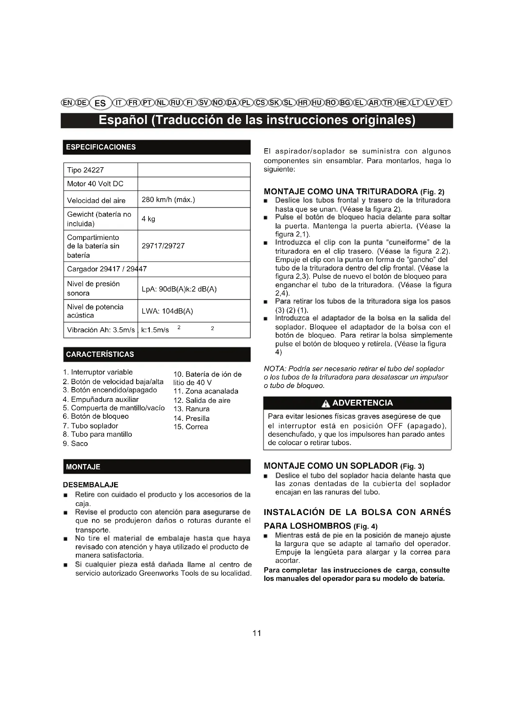 10ESPECIFICACIONES Tipo 24227 Motor 40 Volt DC Velocidad del aire 280 km/h (máx.) Gewicht (batería no incluida) 4 kg Compartimiento de la batería sin batería 29717/29727 Cargador 29417 / 29447 Nivel de presión sonora LpA: 90dB(A)k:2 dB(A) Nivel de potencia acústica LWA: 104dB(A) Vibración Ah: 3.5m/s , k:1.5m/s CARACTERÍSTICAS