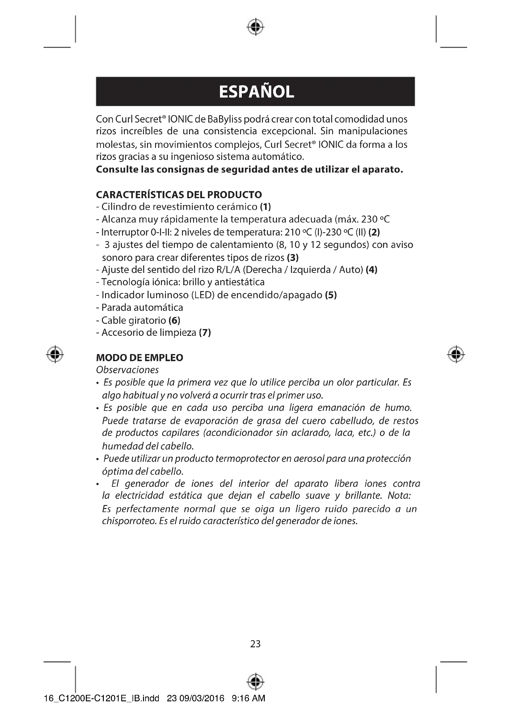 - Seleccione el ajuste del sentido del rizo en función del resultado deseado: - Para un peinado uniforme y más sosticado, ajuste el aparato en la posición «L» (izquierda) para realizar unos rizos en el lado izquierdo de la cabeza. A continuación, ajuste el aparato en la posición «R» (derecha) para realizar unos rizos en el lado derecho de la cabeza. - Para un peinado más suave y más natural, ajuste el aparato en la posición automática «A» (auto). Este ajuste permite crear unos rizos en un sentido y luego en el sentido opuesto alternativamente. 16_C1200E-C1201E_IB.indd 24 09/03/2016 9:16 AM25 Advertencias de uso