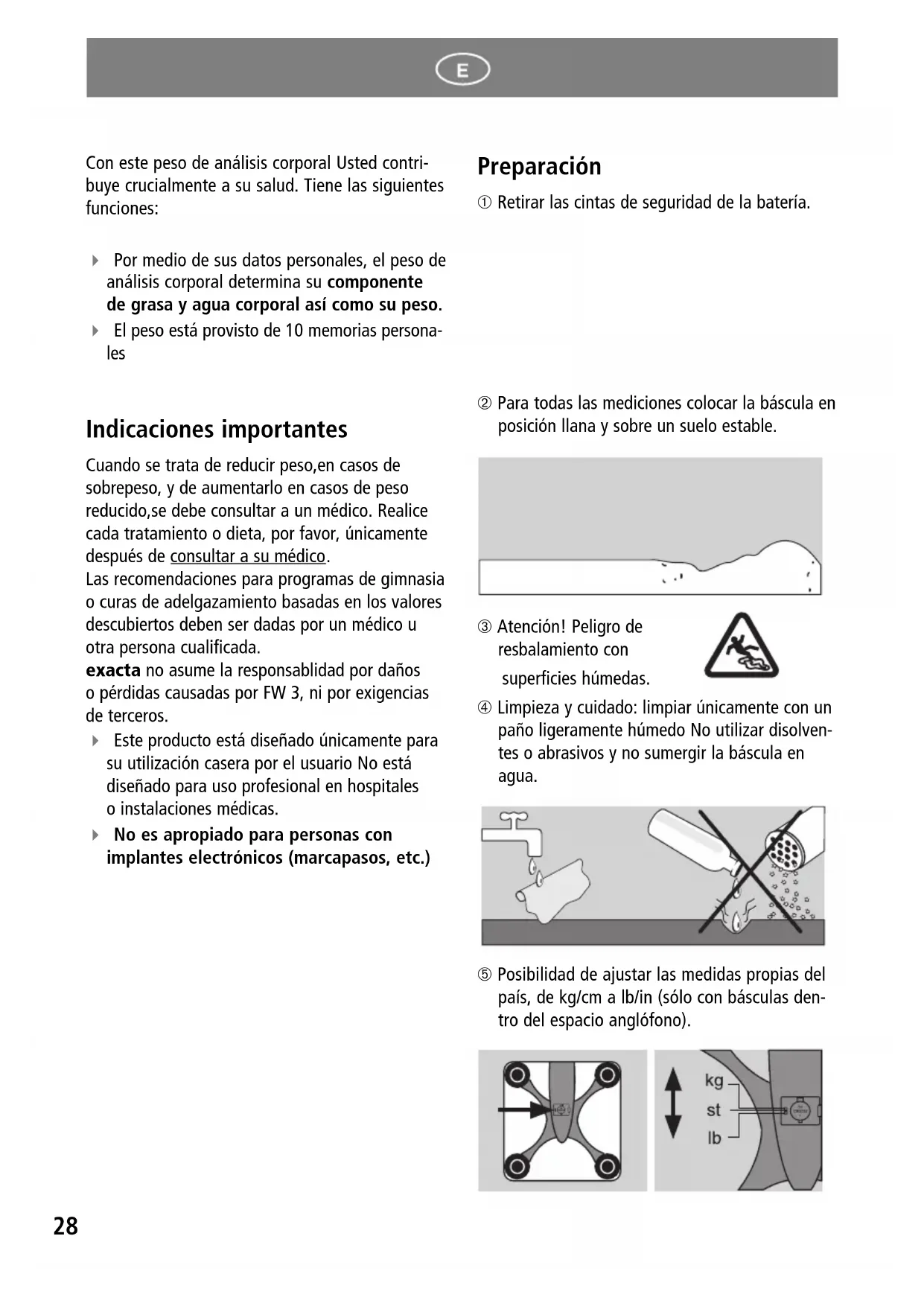 Los analisis se basan en la medicación de la resistencia electrónica del cuerpo. Los hábitos de comida y bebida durante el transcurso del día y el estudio individual de vida tienen influencia en el contenido de agua. Esto se hace notar mediante oscilaciones en la pantalla. Para Obtener un的结果ado de analisis lo más exacto y constante possible, trate demantenerunas conditiones de medicación constantes, puis sólo asi pueda observar con exactitud los Cambios en un lapso de tiempo largo.