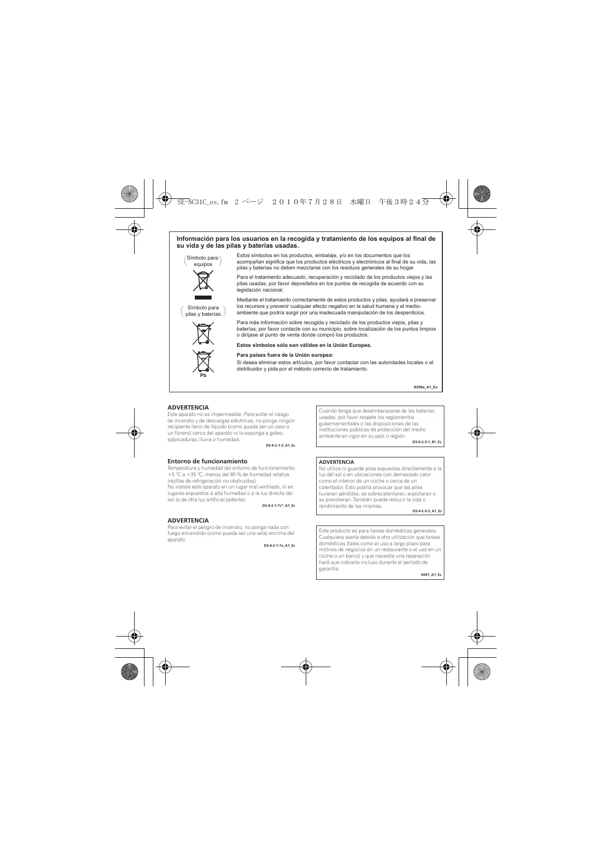 Cualquiera avería debida a otra utilización que tareas domésticas (tales como el uso a largo plazo para motivos de negocios en un restaurante o el uso en un coche o un barco) y que necesita una reparación hará que cobrarla incluso durante el período de garantía. K041_A1_Es