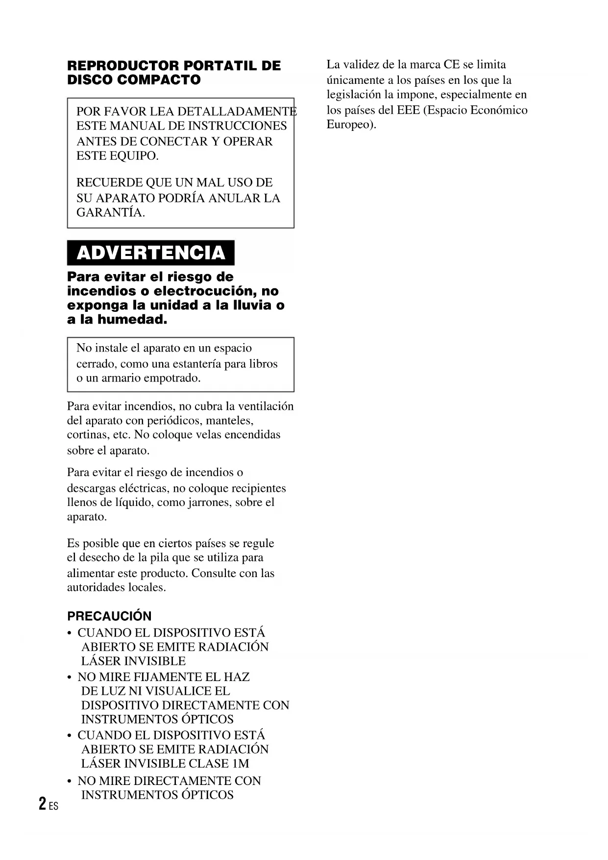 GARANTÍA. ADVERTENCIA Para evitar el riesgo de incendios o electrocución, no exponga la unidad a la lluvia o a la humedad. No instale el aparato en un espacio cerrado, como una estantería para libros o un armario empotrado. Para evitar incendios, no cubra la ventilación del aparato con periódicos, manteles, cortinas, etc. No coloque velas encendidas sobre el aparato. Para evitar el riesgo de incendios o descargas eléctricas, no coloque recipientes llenos de líquido, como jarrones, sobre el aparato. Es posible que en ciertos países se regule el desecho de la pila que se utiliza para alimentar este producto. Consulte con las autoridades locales. PRECAUCIÓN