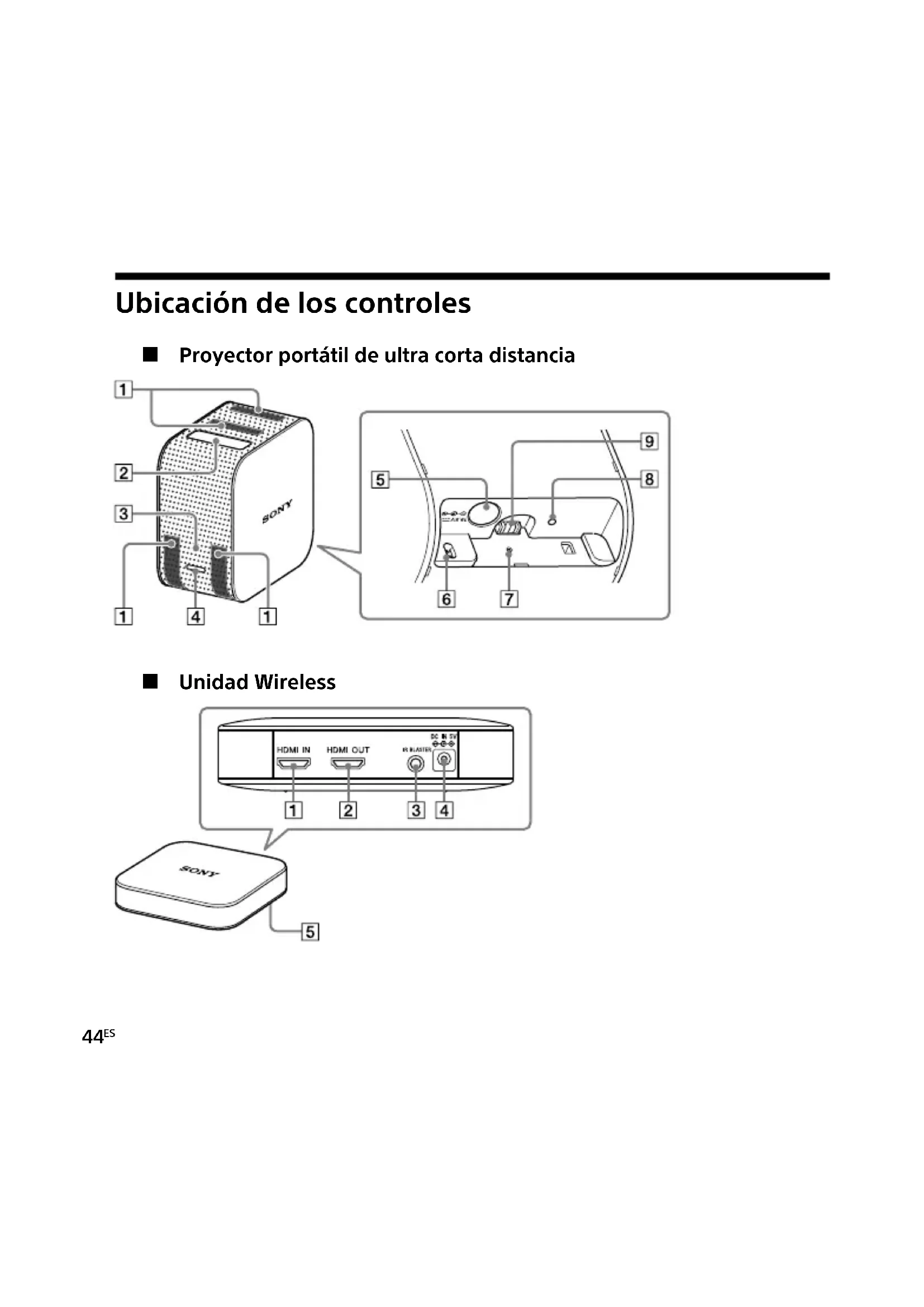 DEUbicación de los controles Proyector portátil de ultra corta distancia Unidad Wireless