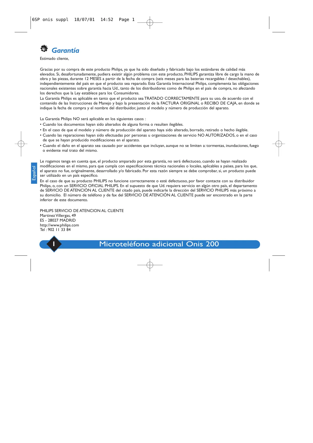 6SP onis suppl 18/07/01 14:52 Page 3 Consejos y seguridad Este MICROTELÉFONO adicional, común a lo modelos Onis 200 y Onis 200 Vox, completará su instalación y le permitirá disponer permanente un teléfono inalámbrico en las habitaciones no equipadas con una toma telefónica. Usted puede utilizar hasta 8 MICROTELÉFONOES adicionales con los modelos Onis 200 y Onis 200 Vox. Para poder beneficiar de todas las posibilidades del MICROTELÉFONO, consulte las instrucciones entregadas con la BASE y el MICROTELÉFONO principal. Este MICROTELÉFONO compatible con la norma GAP puede funcionar con cualquier base GAP, sin importar su marca. Lea atentamente las instrucciones en las que se tienen en cuenta las sugerencias y observaciones de los usuarios. Informaciones de seguridad: Español