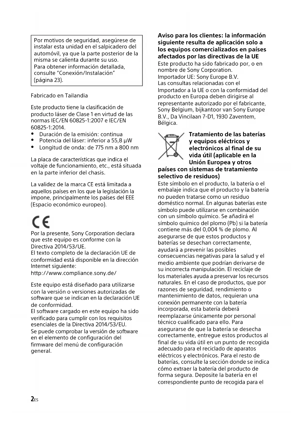 - Rimozione e installazione del pannello anteriore Azzeramento dell’apparecchio Sostituzione del fusibile Fusibile (10 A)2ES Fabricado en Tailandia Este producto tiene la clasificación de producto láser de Clase 1 en virtud de las normas IEC/EN 60825-1:2007 e IEC/EN 60825-1:2014. Duración de la emisión: continua Potencia del láser: inferior a 55,8 μW Longitud de onda: de 775 nm a 800 nm La placa de características que indica el voltaje de funcionamiento, etc., está situada en la parte inferior del chasis. La validez de la marca CE está limitada a aquellos países en los que la legislación la impone, principalmente los países del EEE (Espacio económico europeo). Por la presente, Sony Corporation declara que este equipo es conforme con la Directiva 2014/53/UE. El texto completo de la declaración UE de conformidad está disponible en la dirección Internet siguiente: http://www.compliance.sony.de/ Este equipo está diseñado para utilizarse con la versión o versiones autorizadas de software que se indican en la declaración UE de conformidad. El software cargado en este equipo ha sido verificado para cumplir con los requisitos esenciales de la Directiva 2014/53/EU. Se puede comprobar la versión de software en el elemento de configuración del firmware del menú de configuración general. Aviso para los clientes: la información siguiente resulta de aplicación solo a los equipos comercializados en países afectados por las directivas de la UE Este producto ha sido fabricado por, o en nombre de Sony Corporation. Importador UE: Sony Europe B.V. Las consultas relacionadas con el Importador a la UE o con la conformidad del producto en Europa deben dirigirse al representante autorizado por el fabricante, Sony Belgium, bijkantoor van Sony Europe B.V., Da Vincilaan 7-D1, 1930 Zaventem, Bélgica. Tratamiento de las baterías y equipos eléctricos y electrónicos al final de su vida útil (aplicable en la Unión Europea y otros países con sistemas de tratamiento selectivo de residuos) Este símbolo en el producto, la batería o el embalaje indica que el producto y la batería no pueden tratarse como un residuo doméstico normal. En algunas baterías este símbolo puede utilizarse en combinación con un símbolo químico. Se añadirá el símbolo químico del plomo (Pb) si la batería contiene más del 0,004 % de plomo. Al asegurarse de que estos productos y baterías se desechan correctamente, ayudará a prevenir las posibles consecuencias negativas para la salud y el medio ambiente que podrían derivarse de su incorrecta manipulación. El reciclaje de los materiales ayuda a preservar los recursos naturales. En el caso de productos, que por razones de seguridad, rendimiento o mantenimiento de datos, requieran una conexión permanente con la batería incorporada, esta batería deberá reemplazarse únicamente por personal técnico cualificado para ello. Para asegurarse de que la batería se desecha correctamente, entregue estos productos al final de su vida útil en un punto de recogida adecuado para el reciclado de aparatos eléctricos y electrónicos. Para el resto de baterías, consulte la sección donde se indica cómo extraer la batería del producto de forma segura. Deposite la batería en el correspondiente punto de recogida para el Por motivos de seguridad, asegúrese de instalar esta unidad en el salpicadero del automóvil, ya que la parte posterior de la misma se calienta durante su uso. Para obtener información detallada, consulte “Conexión/Instalación” (página 23).3ES reciclado de baterías. Si desea obtener información detallada sobre el reciclaje de este producto o de la batería, póngase en contacto con el ayuntamiento, el punto de recogida más cercano o el establecimiento donde ha adquirido el producto o la batería. PRECAUCIÓN El intervalo de frecuencias siguiente de 65 – 74 MHz no está destinado a la retransmisión de sonido según el cuadro de atribución de frecuencias común europeo y no puede utilizarse en Europa. Nota legal acerca de los servicios prestados por otros proveedores Los servicios prestados por otros proveedores están sujetos a cambios, anulaciones o interrupciones sin previo aviso. Sony no asume responsabilidad alguna en estas situaciones. Advertencia: si el encendido del automóvil no dispone de una posición ACC Asegúrese de seleccionar la función AUTO OFF (página 13). La unidad se apagará totalmente y de forma automática en el tiempo definido después de apagar la unidad y una vez que aparezca el reloj (mantenga pulsado OFF durante 1 segundo), para evitar que se agote la batería. Si no utiliza la función AUTO OFF, mantenga pulsado OFF hasta que desaparezca la imagen cada vez que apague el contacto.4ES Tabla de contenidos Guía de elementos y controles p. 5