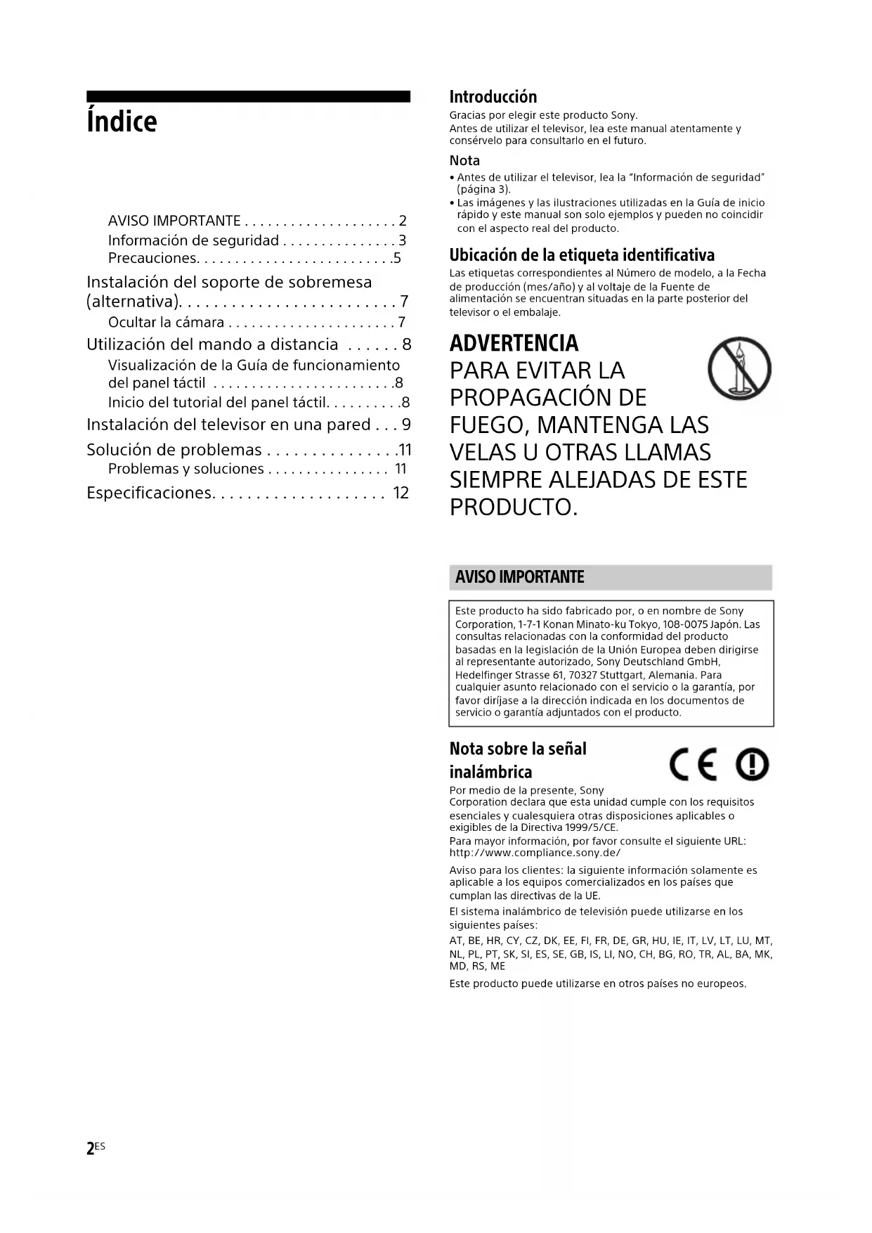PRODUCTO. Nota sobre la señal inalámbrica Por medio de la presente, Sony Corporation declara que esta unidad cumple con los requisitos esenciales y cualesquiera otras disposiciones aplicables o exigibles de la Directiva 1999/5/CE.Para mayor información, por favor consulte el siguiente URL:http://www.compliance.sony.de/Aviso para los clientes: la siguiente información solamente es aplicable a los equipos comercializados en los países que cumplan las directivas de la UE.El sistema inalámbrico de televisión puede utilizarse en los siguientes países:AT, BE, HR, CY, CZ, DK, EE, FI, FR, DE, GR, HU, IE, IT, LV, LT, LU, MT, NL, PL, PT, SK, SI, ES, SE, GB, IS, LI, NO, CH, BG, RO, TR, AL, BA, MK, MD, RS, MEEste producto puede utilizarse en otros países no europeos. AVISO IMPORTANTE Este producto ha sido fabricado por, o en nombre de Sony Corporation, 1-7-1 Konan Minato-ku Tokyo, 108-0075 Japón. Las consultas relacionadas con la conformidad del producto basadas en la legislación de la Unión Europea deben dirigirse al representante autorizado, Sony Deutschland GmbH, Hedelfinger Strasse 61, 70327 Stuttgart, Alemania. Para cualquier asunto relacionado con el servicio o la garantía, por favor diríjase a la dirección indicada en los documentos de servicio o garantía adjuntados con el producto.3