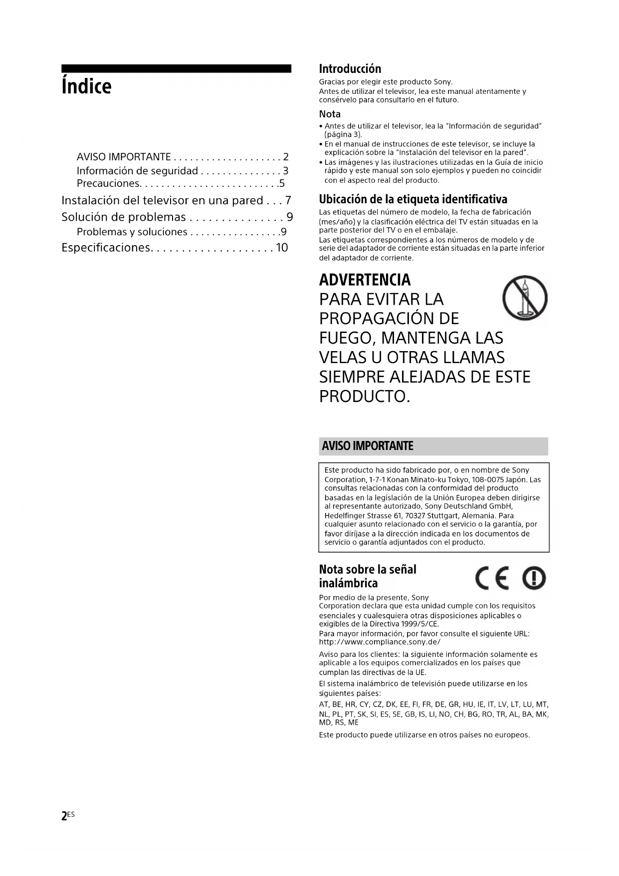 PRODUCTO. Nota sobre la señal inalámbrica Por medio de la presente, Sony Corporation declara que esta unidad cumple con los requisitos esenciales y cualesquiera otras disposiciones aplicables o exigibles de la Directiva 1999/5/CE.Para mayor información, por favor consulte el siguiente URL:http://www.compliance.sony.de/Aviso para los clientes: la siguiente información solamente es aplicable a los equipos comercializados en los países que cumplan las directivas de la UE.El sistema inalámbrico de televisión puede utilizarse en los iguientes países:AT, BE, HR, CY, CZ, DK, EE, FI, FR, DE, GR, HU, IE, IT, LV, LT, LU, MT, NL, PL, PT, SK, SI, ES, SE, GB, IS, LI, NO, CH, BG, RO, TR, AL, BA, MK, MD, RS, MEEste producto puede utilizarse en otros países no europeos. AVISO IMPORTANTE Este producto ha sido fabricado por, o en nombre de Sony Corporation, 1-7-1 Konan Minato-ku Tokyo, 108-0075 Japón. Las consultas relacionadas con la conformidad del producto basadas en la legislación de la Unión Europea deben dirigirse al representante autorizado, Sony Deutschland GmbH, Hedelfinger Strasse 61, 70327 Stuttgart, Alemania. Para cualquier asunto relacionado con el servicio o la garantía, por favor diríjase a la dirección indicada en los documentos de servicio o garantía adjuntados con el producto.3