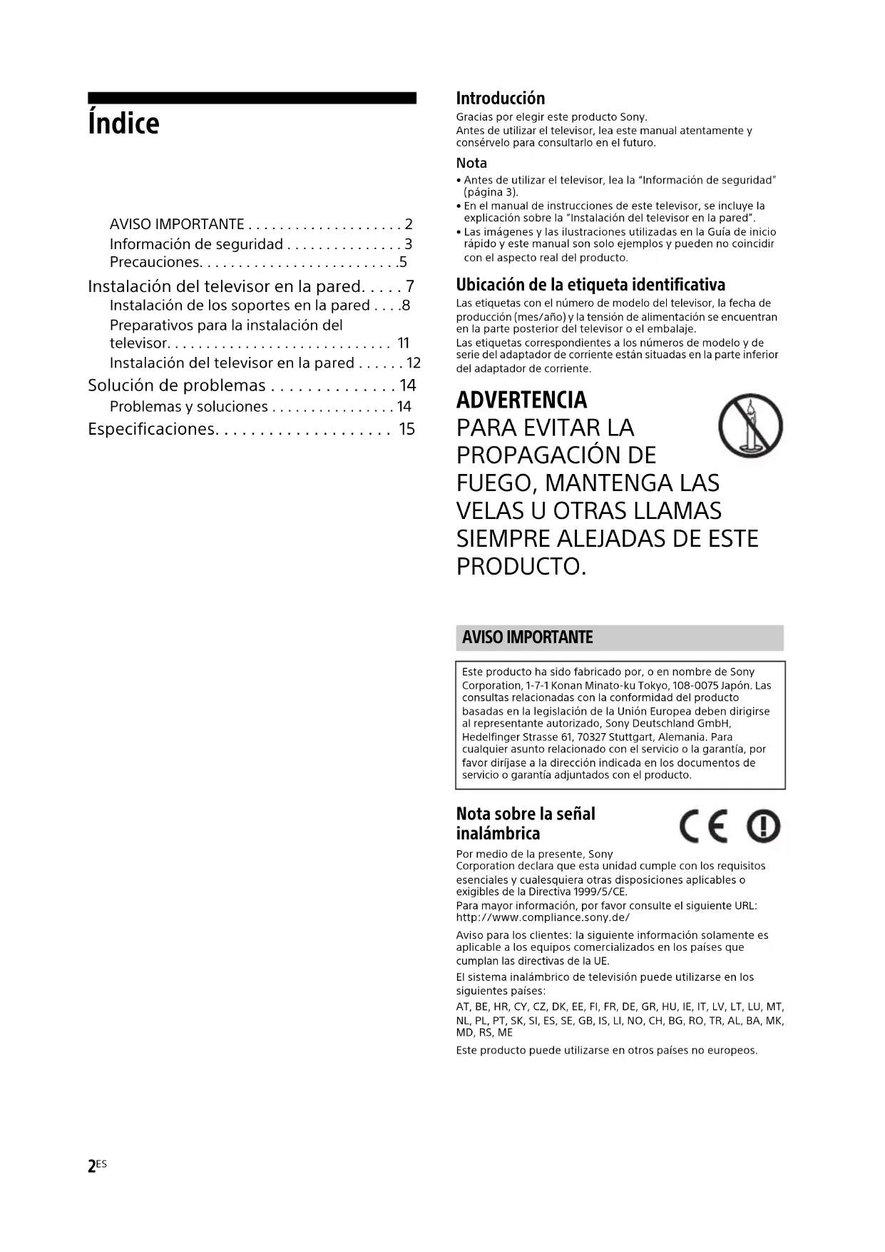 PRODUCTO. Nota sobre la señal inalámbrica Por medio de la presente, Sony Corporation declara que esta unidad cumple con los requisitos esenciales y cualesquiera otras disposiciones aplicables o exigibles de la Directiva 1999/5/CE.Para mayor información, por favor consulte el siguiente URL:http://www.compliance.sony.de/Aviso para los clientes: la siguiente información solamente es aplicable a los equipos comercializados en los países que cumplan las directivas de la UE.El sistema inalámbrico de televisión puede utilizarse en los siguientes países:AT, BE, HR, CY, CZ, DK, EE, FI, FR, DE, GR, HU, IE, IT, LV, LT, LU, MT, NL, PL, PT, SK, SI, ES, SE, GB, IS, LI, NO, CH, BG, RO, TR, AL, BA, MK, MD, RS, MEEste producto puede utilizarse en otros países no europeos. AVISO IMPORTANTE Este producto ha sido fabricado por, o en nombre de Sony Corporation, 1-7-1 Konan Minato-ku Tokyo, 108-0075 Japón. Las consultas relacionadas con la conformidad del producto basadas en la legislación de la Unión Europea deben dirigirse al representante autorizado, Sony Deutschland GmbH, Hedelfinger Strasse 61, 70327 Stuttgart, Alemania. Para cualquier asunto relacionado con el servicio o la garantía, por favor diríjase a la dirección indicada en los documentos de servicio o garantía adjuntados con el producto.3