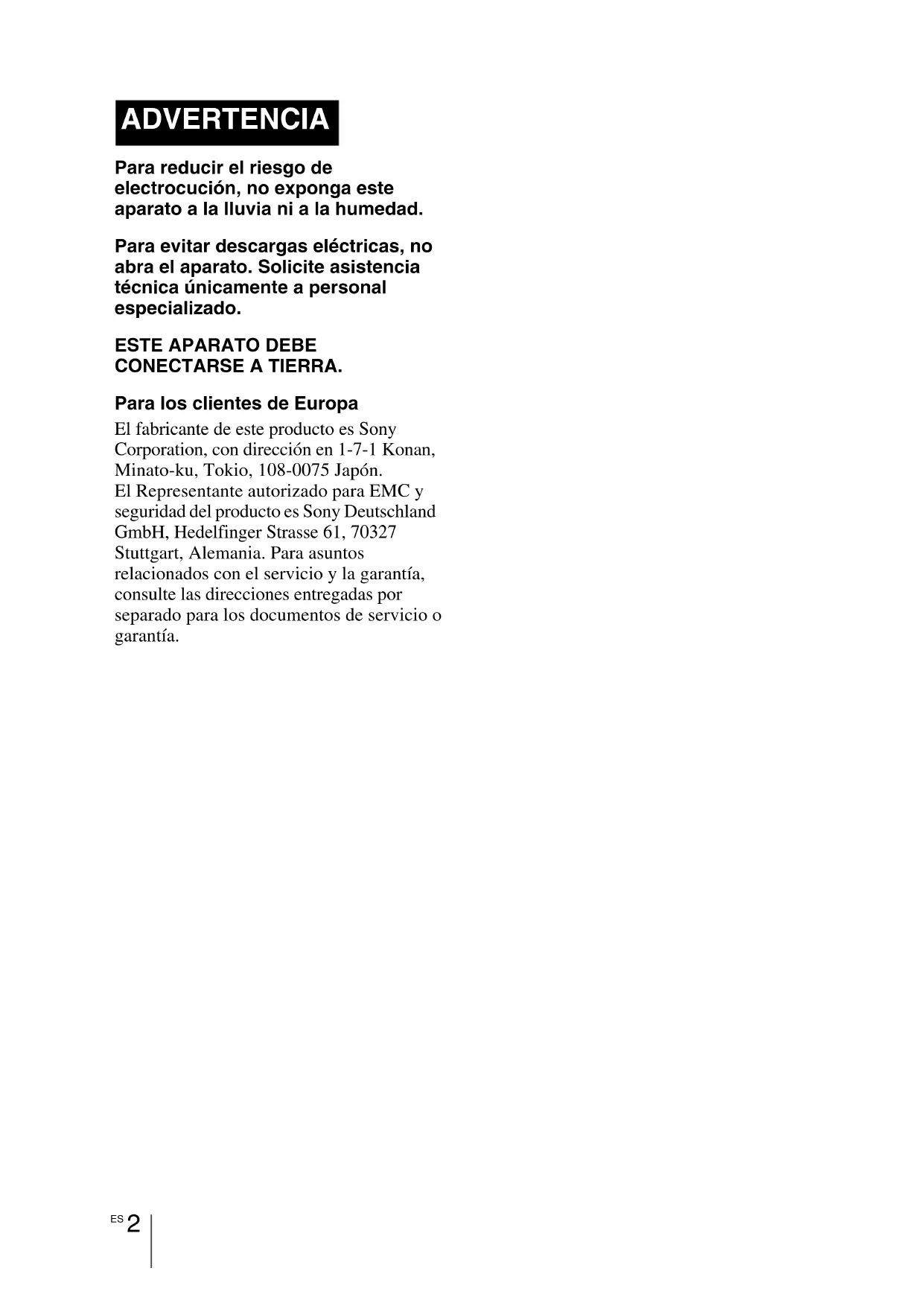 CONECTARSE A TIERRA. Para los clientes de Europa El fabricante de este producto es Sony Corporation, con dirección en 1-7-1 Konan, Minato-ku, Tokio, 108-0075 Japón. El Representante autorizado para EMC y seguridad del producto es Sony Deutschland GmbH, Hedelfinger Strasse 61, 70327 Stuttgart, Alemania. Para asuntos relacionados con el servicio y la garantía, consulte las direcciones entregadas por separado para los documentos de servicio o garantía. ADVERTENCIA3