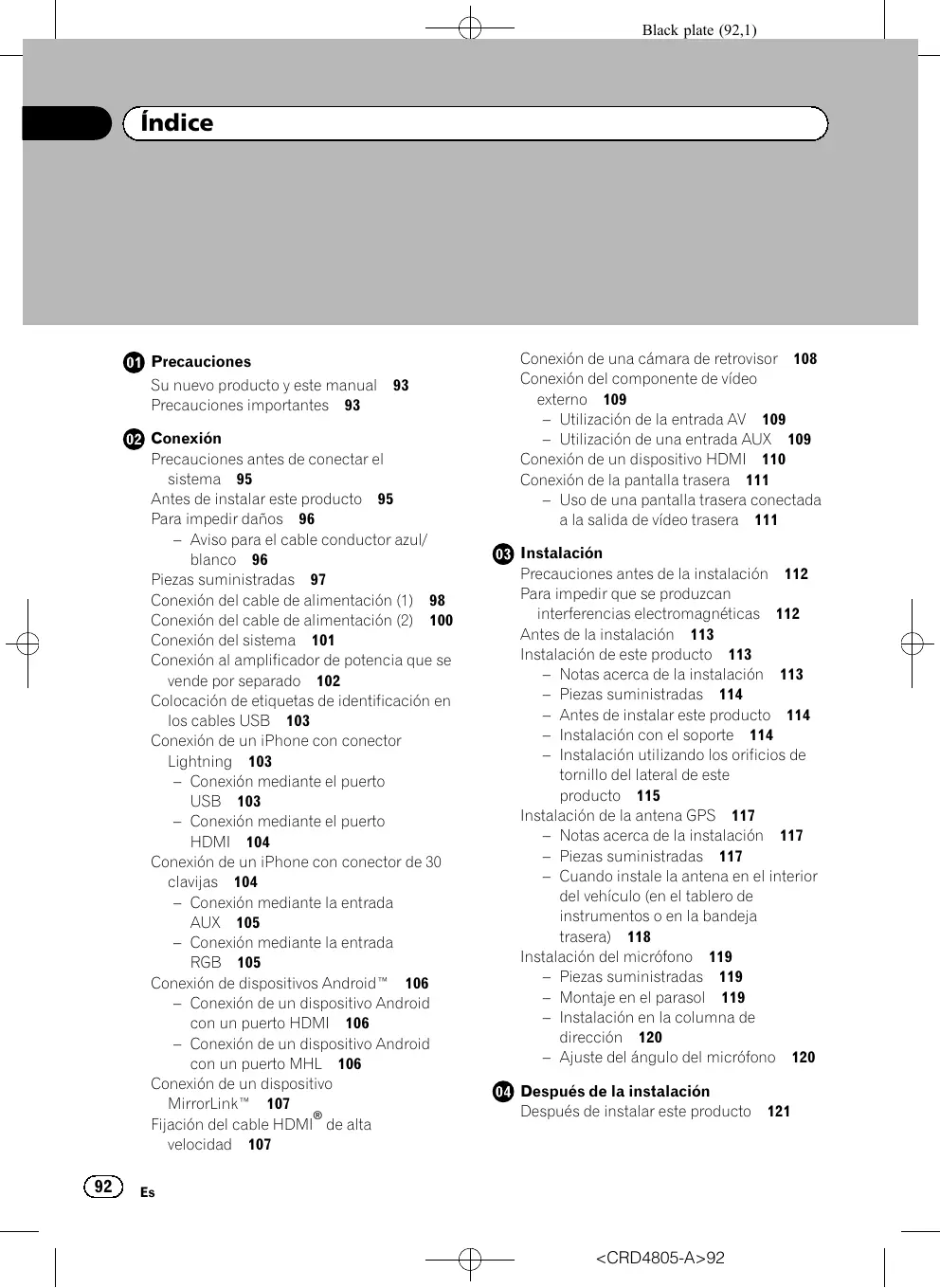<CRD4805-A>92 Su nuevo producto y este manual Precauciones importantes ! No utilice el producto, las aplicaciones ni la opción de cámara de retrovisor (si dispone de ella) si hacerlo puede distraerle e impedirle que conduzca de manera segura. Cumpla siempre las normas de seguridad relativas a la conducción y respete todas las regulaciones de tráfico existentes. Si tiene problemas a la hora de utilizar este producto o leer la pantalla, aparque el vehículo en un lugar seguro y ponga el freno de mano antes de realizar los ajustes necesarios. ! Este manual explica cómo instalar este producto en su vehículo. El funcionamiento del mismo se explica en otros manuales. ! No instale este producto en un lugar que pueda (i) impedir la visión del conductor, (ii) afectar al rendimiento de cualquier otro sistema del vehículo o función de seguridad, como los airbags, los botones de las luces de advertencia, o (iii) impedir que se pueda conducir de forma segura. En algunos casos, es posible que no pueda instalarse este producto debido al tipo de vehículo o a la forma del interior del vehículo. Pioneer aconseja que no realice usted mismo la instalación del producto. Este producto se ha diseñado para que su instalación la realice únicamente un instalador profesional. Recomendamos que sólo el personal de servicio autorizado de Pioneer, que cuenta con formación especializada y experiencia en el campo de la electrónica móvil, instale y configure este producto. NUNCA EFECTÚE EL MANTENIMIENTO DE ESTE PRODUCTO USTED MISMO. La instalación o el mantenimiento del producto y de los cables de conexión asociados puede exponerle al riesgo de una descarga eléctrica u otros peligros y puede ocasionar daños en el producto que no cubre la garantía. ADVERTENCIA