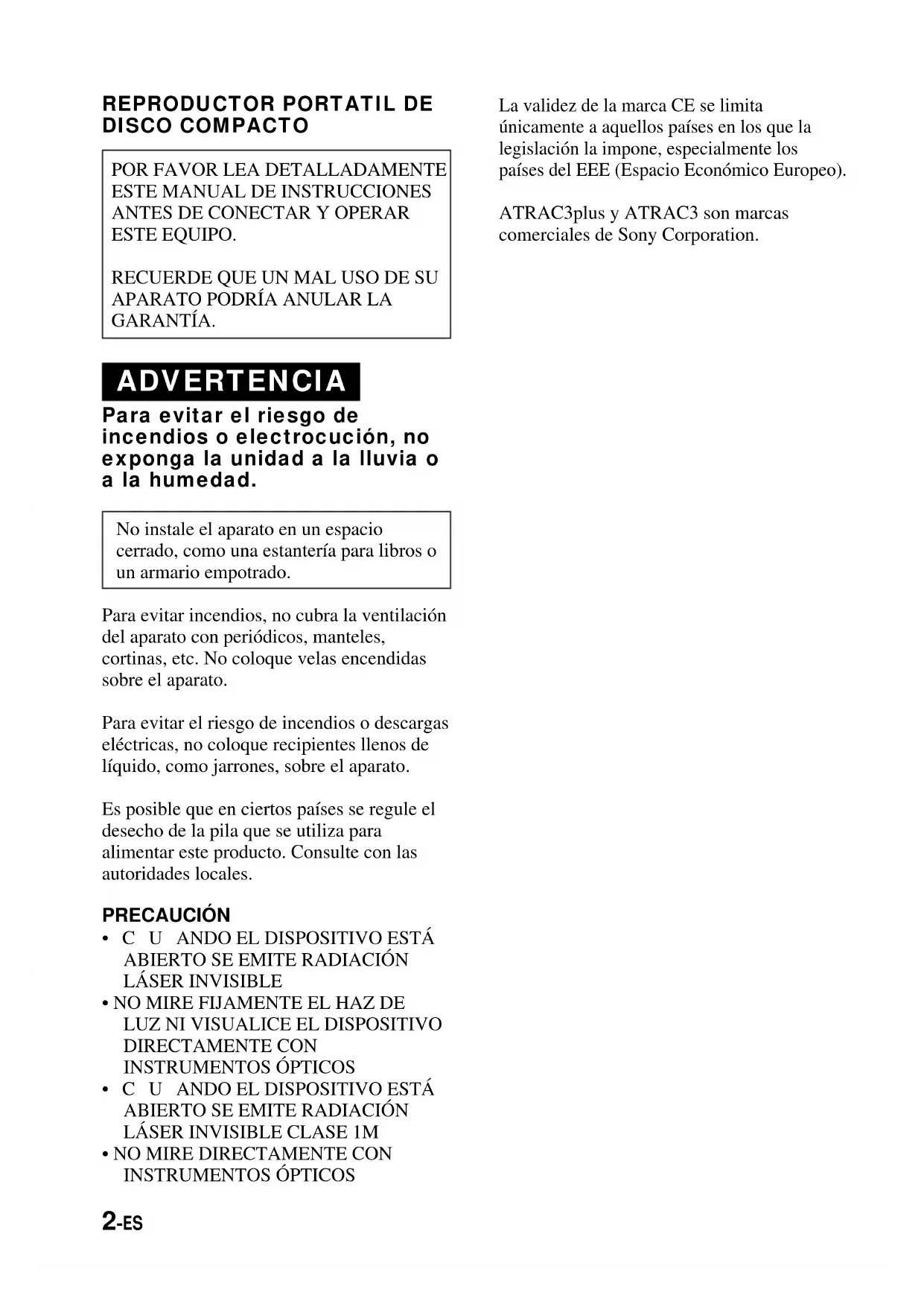GARANTÍA. ADVERTENCIA Para evitar el riesgo de incendios o electrocución, no exponga la unidad a la lluvia o a la humedad. No instale el aparato en un espacio cerrado, como una estantería para libros o un armario empotrado. Para evitar incendios, no cubra la ventilación del aparato con periódicos, manteles, cortinas, etc. No coloque velas encendidas sobre el aparato. Para evitar el riesgo de incendios o descargas eléctricas, no coloque recipientes llenos de líquido, como jarrones, sobre el aparato. Es posible que en ciertos países se regule el desecho de la pila que se utiliza para alimentar este producto. Consulte con las autoridades locales. PRECAUCIÓN