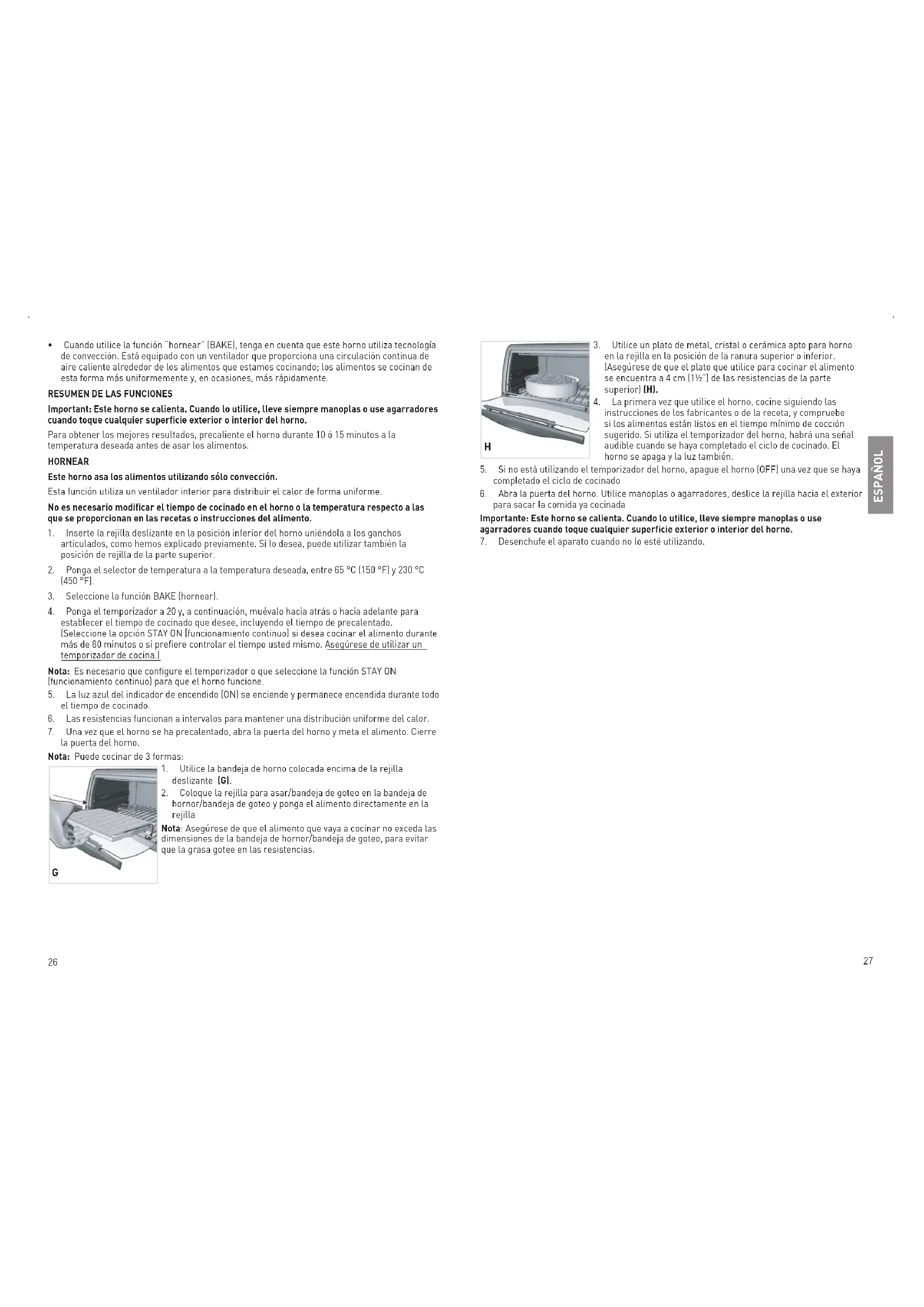 ESTE HORNO SE CALIENTA CUANDO ESTÁ EN USO. SIEMPRE USE AGARRADERAS O GUANTES DE COCINA CUANDO TOQUE TODA SUPERFICIE INTERNA O EXTERNA DEL HORNO.