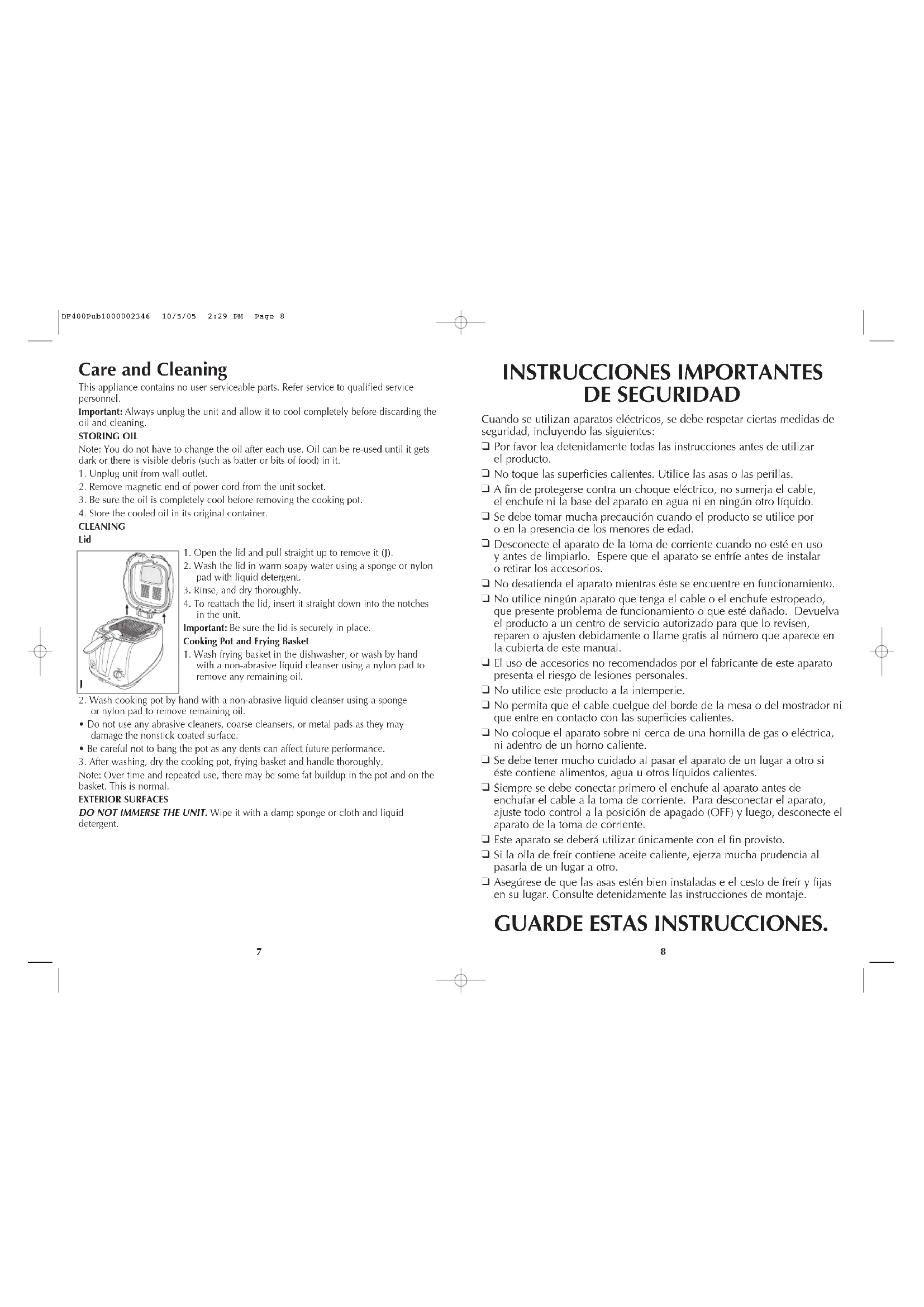 - Les modalités de la présente garantie donnent des droits légaux spécifiques. L’utilisateur peut également se prévaloir d’autres droits selon l’état ou la province qu’il habite. Póliza de Garantía (Válida sólo para México) Duración Applica de México, S. de R. L. de C.V. garantiza este producto por 2 años a partir de la fecha original de compra. ¿Qué cubre esta garantía? Esta Garantía cubre cualquier defecto que presenten las piezas, componentes y la mano de obra contenidas en este producto. Requisitos para hacer válida la garantía Para reclamar su Garantía deberá presentar al Centro de Servicio Autorizado la póliza sellada por el establecimiento en donde adquirió el producto. Si no la tiene, podrá presentar el comprobante de compra original. ¿Donde hago válida la garantía? Llame sin costo al teléfono 01 800 714 2503, para ubicar el Centro de Servicio Autorizado más cercano a su domicilio en donde usted podrá encontrar partes, componentes, consumibles y accesorios. Procedimiento para hacer válida la garantía Acuda al Centro de Servicio Autorizado con el producto con la póliza de Garantía sellada o el comprobante de compra original, ahí se reemplazará cualquier pieza o componente defectuoso sin cargo alguno para el usuario final. Esta Garantía incluye los gastos de transportación que se deriven de su cumplimiento. Excepciones Esta Garantía no será válida cuando el producto: A) Se hubiese utilizado en condiciones distintas a las normales. B) No hubiese sido operado de acuerdo con el instructivo de uso que le acompaña. C) Cuando el producto hubiese sido alterado o reparado por personas no autorizadas por Applica de México, S. de R. L. de C.V. Nota: Si el cordón de alimentación es dañado, este debe ser remplazado por el fabricante o por un Centro de Servicio Autorizado para evitar el riesgo. DF400Pub1000002346 10/5/05 2:29 PM Page 26is a trademark of The Black & Decker Corporation, Towson, Maryland, USA Marca registrada de The Black & Decker Corporation, Towson, Maryland, E.U. Marque de commerce déposée de la société The Black & Decker Corporation, Towson, Maryland, É.-U. 2005/5-19-95 E/S/F 1500 W 120 V 60 Hz Copyright © 2005 Applica Consumer Products, Inc. Pub. No. 1000002346-00-RV00 Made in People’s Republic of China Printed in People’s Republic of China Importado por: Applica de México S. de R.L. de C.V. Blvd. Manuel Avila Camacho 2900 Int. 902 Los Pirules, Tlalnepantla, Edo. Mex. C.P. 54040 México Teléfono: (55) 1106-1400 Del interior marque sin costo 01 (800) 714-2499 Fabricado en la República Popular de China Impreso en la República Popular de China Fabriqué en République populaire de Chine Imprimé en République populaire de Chine DF400Pub1000002346 10/5/05 2:29 PM Page 28