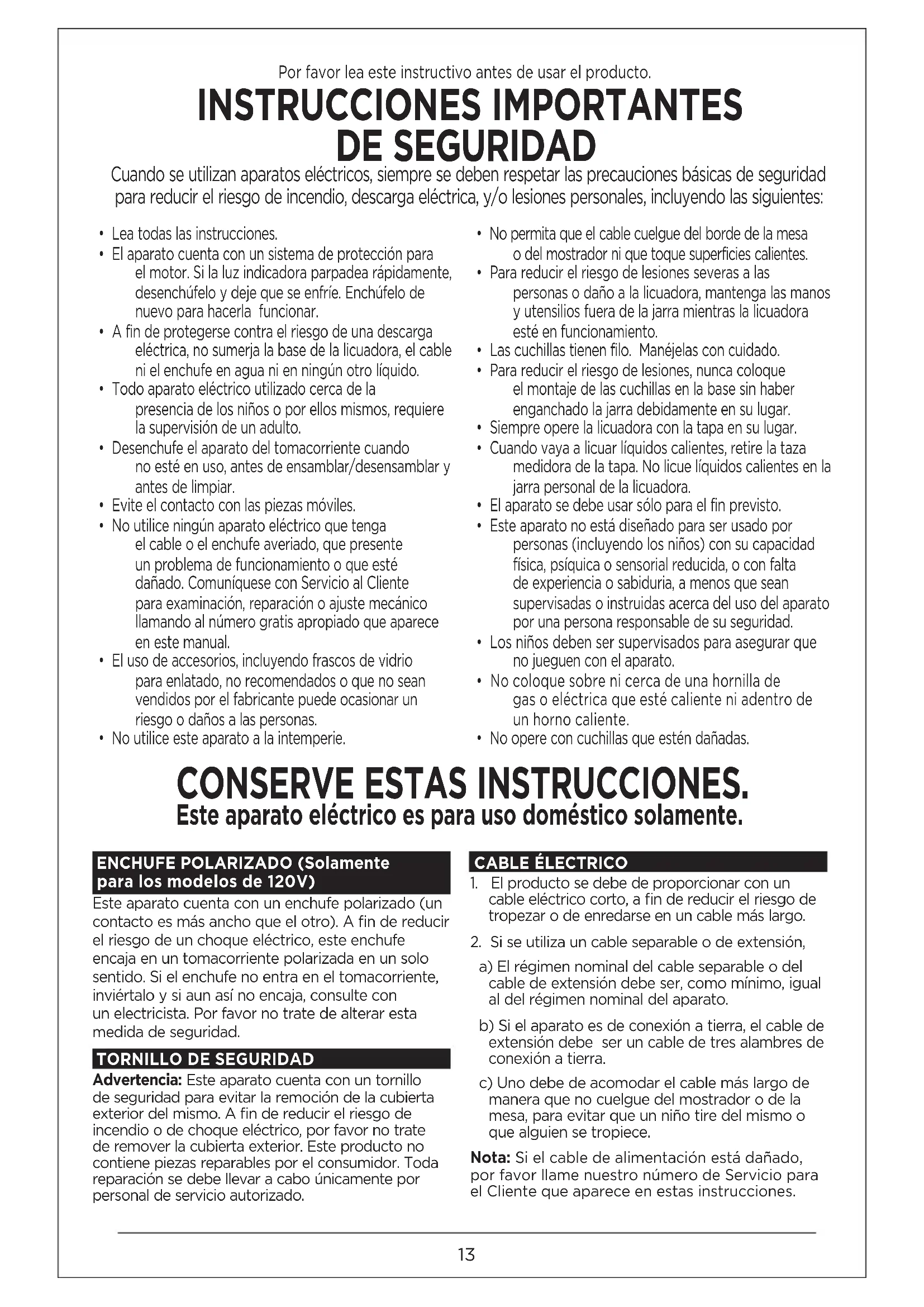 - A fin de protegerse contra el riesgo de una descarga eléctrica, no sumerja la base de la licuadora, el cable ni el enchufe en agua ni en ningún otro líquido.