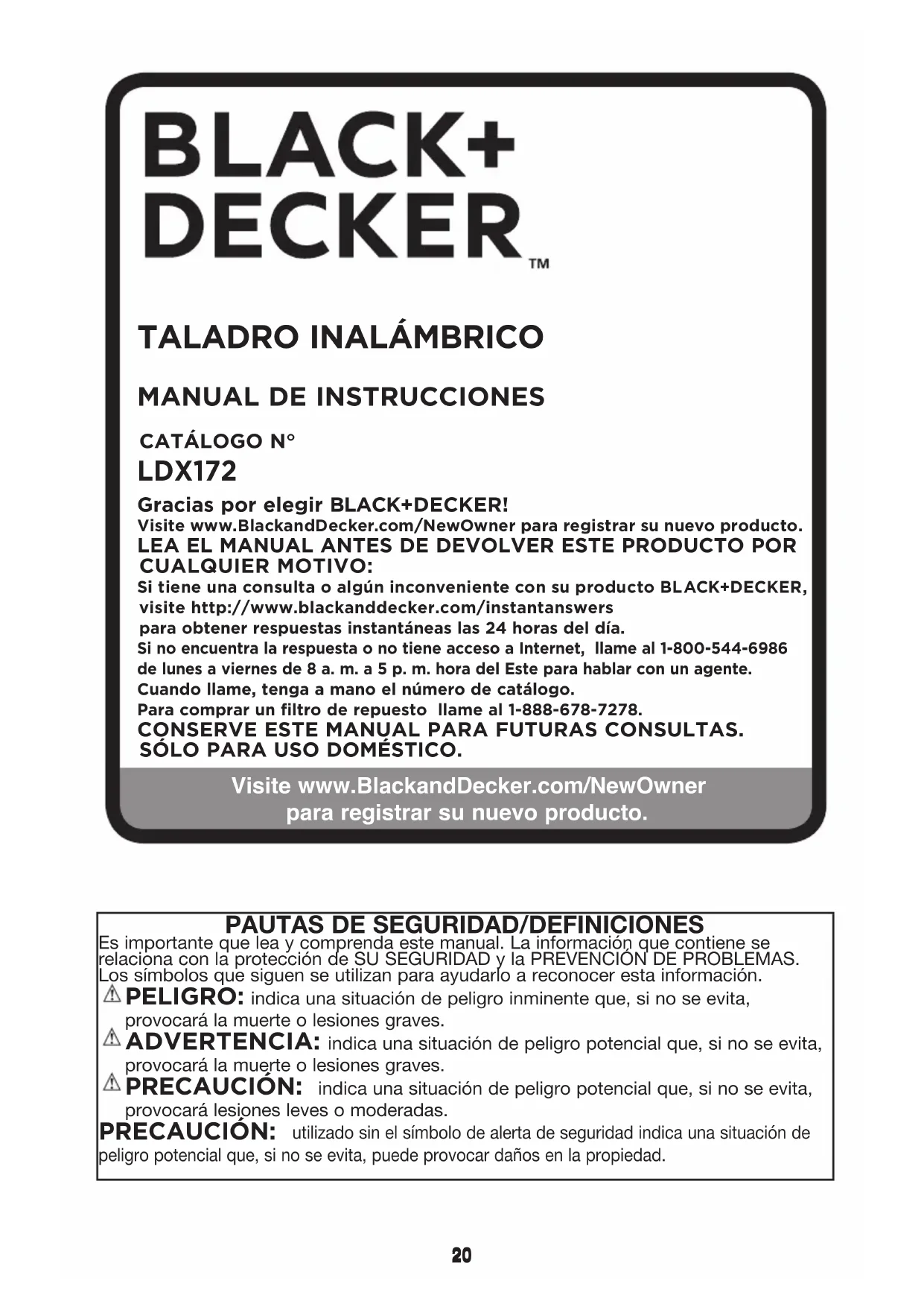 Gracias por elegir BLACK+DECKER! Visite www.BlackandDecker.com/NewOwner para registrar su nuevo producto. LEA EL MANUAL ANTES DE DEVOLVER ESTE PRODUCTO POR CUALQUIER MOTIVO: Si tiene una consulta o algún inconveniente con su producto BLACK+DECKER, visite http://www.blackanddecker.com/instantanswers para obtener respuestas instantáneas las 24 horas del día.Si no encuentra la respuesta o no tiene acceso a Internet, llame al 1-800-544-6986 de lunes a viernes de 8 a. m. a 5 p. m. hora del Este para hablar con un agente. Cuando llame, tenga a mano el número de catálogo.Para comprar un filtro de repuesto llame al 1-888-678-7278.CONSERVE ESTE MANUAL PARA FUTURAS CONSULTAS.SÓLO PARA USO DOMÉSTICO.CATÁLOGO N° LDX172 Pautas de seguridad/definiciones Es importante que lea y comprenda este manual. La información que contiene se relaciona con la protección de SU SEGURIDAD y la PREVENCIÓN DE PROBLEMAS. Los símbolos que siguen se utilizan para ayudarlo a reconocer esta información. PELIGRO: indica una situación de peligro inminente que, si no se evita, provocará la muerte o lesiones graves. ADVERTENCIA: indica una situación de peligro potencial que, si no se evita, provocará la muerte o lesiones graves. PRECAUCIÓN: indica una situación de peligro potencial que, si no se evita, provocará lesiones leves o moderadas. PRECAUCIÓN: utilizado sin el símbolo de alerta de seguridad indica una situación de peligro potencial que, si no se evita, puede provocar daños en la propiedad.21