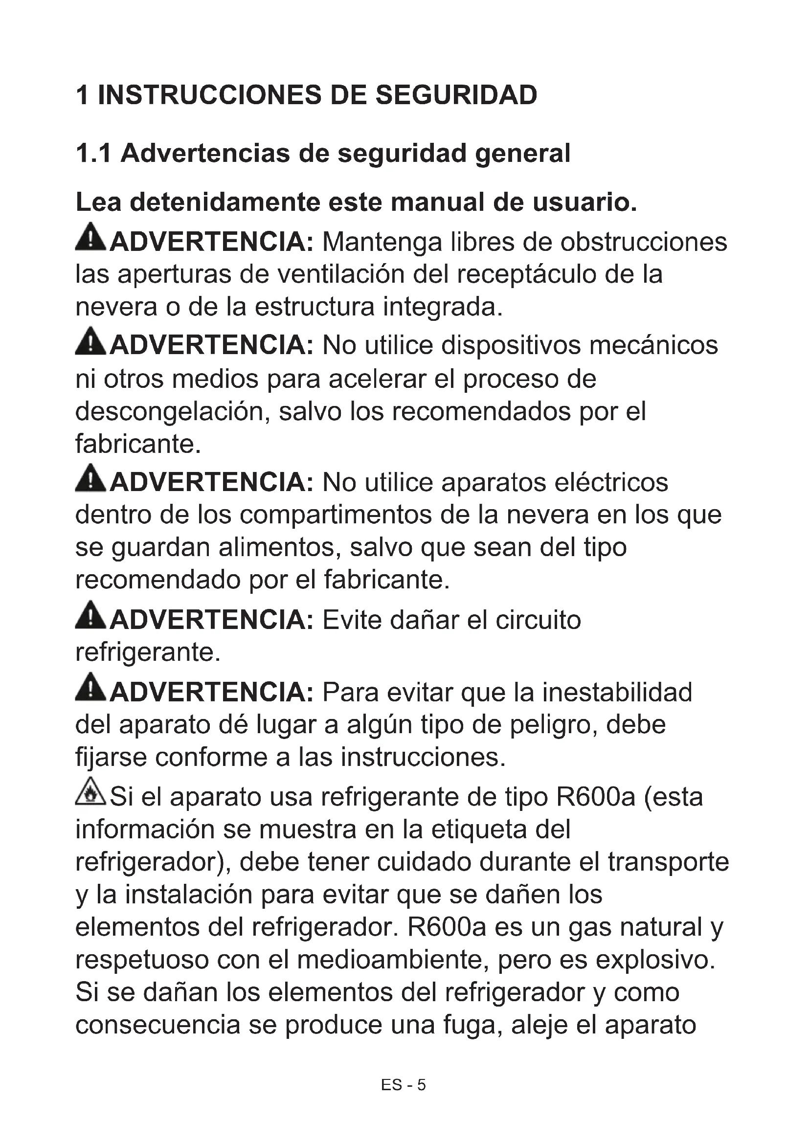 Lea detenidamente este manual de usuario. ADVERTENCIA: Mantenga libres de obstrucciones las aperturas de ventilación del receptáculo de la nevera o de la estructura integrada. ADVERTENCIA: No utilice dispositivos mecánicos ni otros medios para acelerar el proceso de descongelación, salvo los recomendados por el fabricante. ADVERTENCIA: No utilice aparatos eléctricos dentro de los compartimentos de la nevera en los que se guardan alimentos, salvo que sean del tipo recomendado por el fabricante. ADVERTENCIA: Evite dañar el circuito refrigerante. ADVERTENCIA: Para evitar que la inestabilidad del aparato dé lugar a algún tipo de peligro, debe jarse conforme a las instrucciones. Si el aparato usa refrigerante de tipo R600a (esta información se muestra en la etiqueta del refrigerador), debe tener cuidado durante el transporte y la instalación para evitar que se dañen los elementos del refrigerador. R600a es un gas natural y respetuoso con el medioambiente, pero es explosivo. Si se dañan los elementos del refrigerador y como consecuencia se produce una fuga, aleje el aparatoES - 6 de llamas abiertas o fuentes de calor y ventile unos minutos la habitación en la que se encuentra la nevera.