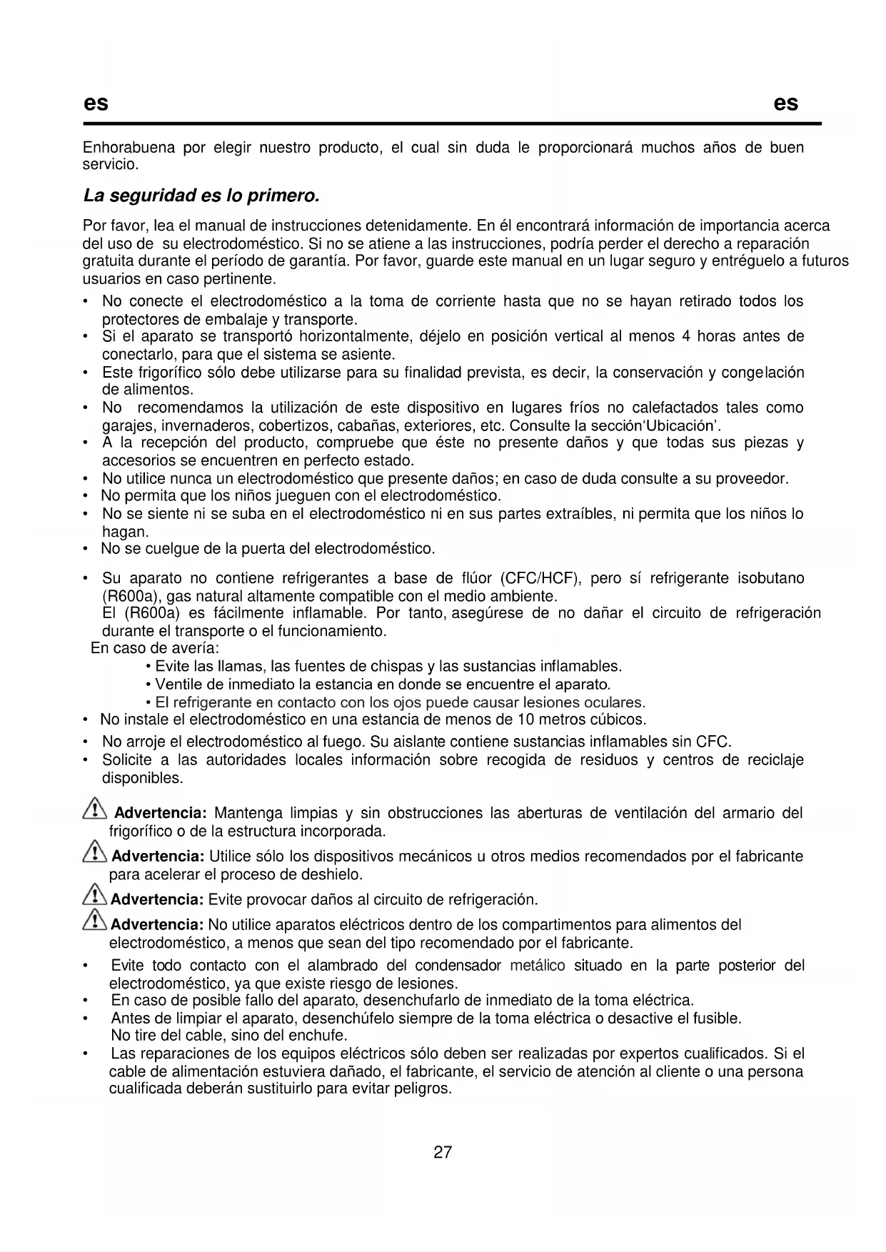 - No arroje el electrodoméstico al fuego. Su aislante contiene sustancias inflamables sin CFC.