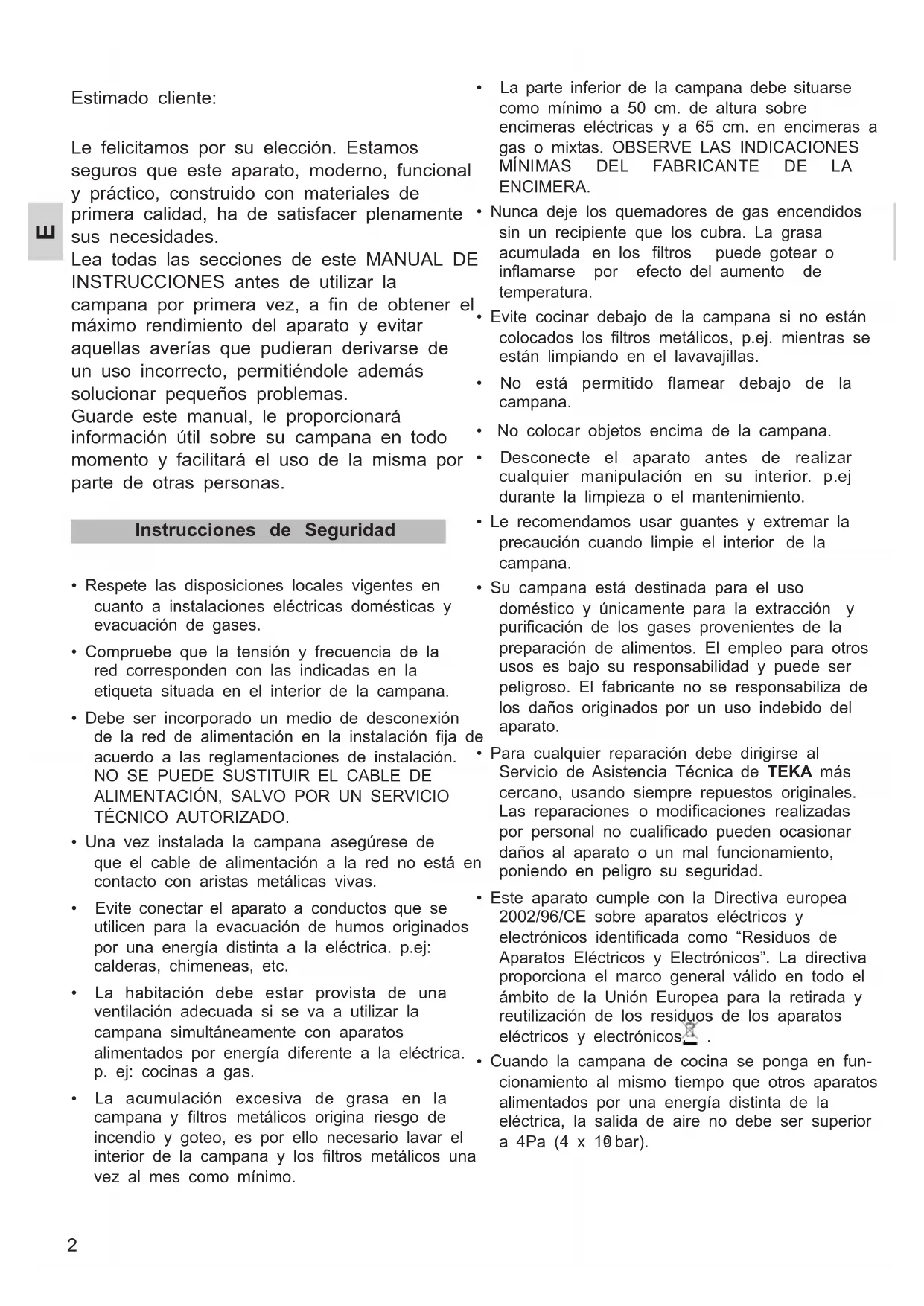 - Para cualquier reparación debe dirigirse al Servicio de Asistencia Técnica de TEKA más cercano, usando siempre repuestos originales. Las reparaciones o modificaciones realizadas por personal no cualificado pueden ocasionar daños al aparato o un mal funcionamiento, poniendo en peligro su seguridad.