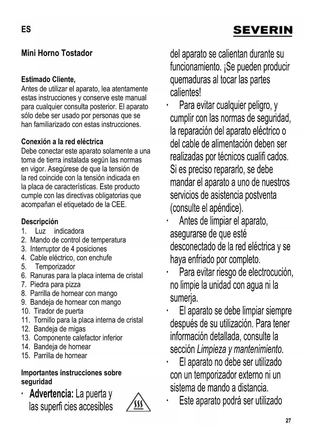 Importantes instrucciones sobre seguridad ∙ Advertencia: La puerta y las superfi cies accesibles del aparato se calientan durante su funcionamiento. ¡Se pueden producir quemaduras al tocar las partes calientes! ∙ Para evitar cualquier peligro, y cumplir con las normas de seguridad, la reparación del aparato eléctrico o del cable de alimentación deben ser realizadas por técnicos cualifi cados. Si es preciso repararlo, se debe mandar el aparato a uno de nuestros servicios de asistencia postventa (consulte el apéndice). ∙ Antes de limpiar el aparato, asegurarse de que esté desconectado de la red eléctrica y se haya enfriado por completo. ∙ Para evitar riesgo de electrocución, no limpie la unidad con agua ni la sumerja. ∙ El aparato se debe limpiar siempre después de su utilización. Para tener información detallada, consulte la sección Limpieza y mantenimiento. ∙ El aparato no debe ser utilizado con un temporizador externo ni un sistema de mando a distancia. ∙ Este aparato podrá ser utilizado ES28 por niños (mayores de 8 años) y personas con reducidas facultades físicas, sensoriales o mentales, o sin experiencia ni conocimiento del producto, siempre que hayan recibido la supervisión o instrucciones referentes al uso del aparato y entiendan por completo el peligro y las precauciones de seguridad. ∙ Los niños no deben jugar con el aparato. ∙ No se debe permitir que los niños realicen ningún trabajo de limpieza o mantenimiento del aparato a menos que esté bajo vigilancia y tengan más de 8 años. ∙ El aparato y su cable eléctrico siempre se deben mantener fuera del alcance de niños menores de 8 años. ∙ Precaución: Mantenga a los niños alejados del material de embalaje, porque podría ser peligroso, existe el peligro de asfi xia. ∙ Antes de utilizar el aparato, siempre se debe comprobar que tanto la unidad principal, el cable de alimentación como cualquier accesorio no están defectuosos. En caso de que el aparato haya caído sobre una superfi cie dura, o se haya tirado en exceso del cable de alimentación, no se deberá utilizar de nuevo: incluso los desperfectos no visibles pueden tener efectos adversos sobre la seguridad en el uso del aparato. ∙ No toque los elementos calefactores. ∙ Antes de utilizar este aparato, debe instalarse la bandeja de migas en la posición correcta debajo del elemento calefactor inferior. ∙ El aceite o la grasa calentados en exceso pueden incendiarse. Por lo tanto no llene en exceso la bandeja de hornear; de este modo evitará que la grasa gotee y caiga sobre el elemento calefactor inferior. ∙ No deje el aparato sin vigilancia durante su funcionamiento. ∙ No utilizar el aparato en el exterior. ∙ Debe asegurar una ventilación sufi ciente en todo momento. No coloque objetos encima de la unidad, y asegúrese de que se respeten las siguientes distancias mínimas de una pared u otro objeto: Lado: 12 cm Superior: 30 cm ∙ No debe instalarse este aparato dentro de un armario; al colocar el aparato, asegúrese también de no situarlo inmediatamente debajo de un armario o de cualquier otro objeto similar. ∙ No debe quitarle los pies que se encuentran en la base de la unidad. ∙ No utilice ni coloque este aparato cerca de objetos tales como cortinas o materiales infl amables. ∙ Cuando el aparato esté funcionando debe colocarse sobre una superfi cie resistente al calor. No coloque el aparato sobre o cerca de superfi cies calientes tales como resistencias eléctricas, ni próximo a una salida de gas u otras fuentes de calor. ∙ Precaución: La piedra para pizza se29 calienta mucho durante el uso, y no se enfriará lentamente después de apagar el aparato y desconectar el cable eléctrico. Existe un riesgo serio de quemaduras por contacto con la piedra. ∙ Espere siempre hasta que la piedra para pizza se haya enfriado por completo antes de extraerla del aparato. ∙ Precaución: No coloque papel de aluminio ni ningún producto similar entre la parrilla de hornear y la piedra para pizza. Coloque la piedra directamente sobre la parrilla. ∙ No deje que el cable de alimentación entre en contacto con ninguna parte del aparato que esté caliente. ∙ No permita que el cable de conexión cuelgue libremente. ∙ Desenchufe siempre el aparato - después del uso, - si hay una avería, y - antes de limpiarlo. ∙ Para desenchufar, no tire nunca del cable; agarre la clavija. ∙ No se acepta la responsabilidad si hay averías a consecuencia del uso incorrecto del aparato o si estas instrucciones no han sido observadas debidamente. ∙ Este aparato ha sido diseñado para el uso doméstico u otra aplicación similar, por ejemplo - en ofi cinas y otros puntos comerciales, - en empresas agrícolas, - por los clientes de hoteles, pensiones, etc. y establecimientos similares, - en casas rurales. Mando de control de temperatura El mando de control de la temperatura se utiliza para seleccionar el nivel de temperatura deseado. Las 4 posiciones del interruptor Calentador superior con aire caliente Calentador superior Calentador inferior Calentador superior e inferior con aire caliente Los dos calentadores se encenderán solo cuando se active el temporizador. Temporizador El temporizador se puede utilizar para seleccionar el tiempo de cocción (como máximo 60 minutos) o para seleccionar el funcionamiento continuo. Si desea que el aparato funcione de modo continuo, gire el botón del temporizador en sentido contrario a las agujas del reloj hasta la posición . Si desea apagar el aparato, gire el botón del temporizador hasta la posición ‘ ’. Si desea programar un tiempo de funcionamiento, gire el botón del temporizador en el sentido de las agujas del reloj hasta el valor deseado. Si desea seleccionar una duración inferior a 10 minutos, gire primero el temporizador a un ajuste superior y después gírelo lentamente hasta el ajuste de tiempo deseado. Cuando el tiempo programado ha llegado a su fi nal, una señal acústic