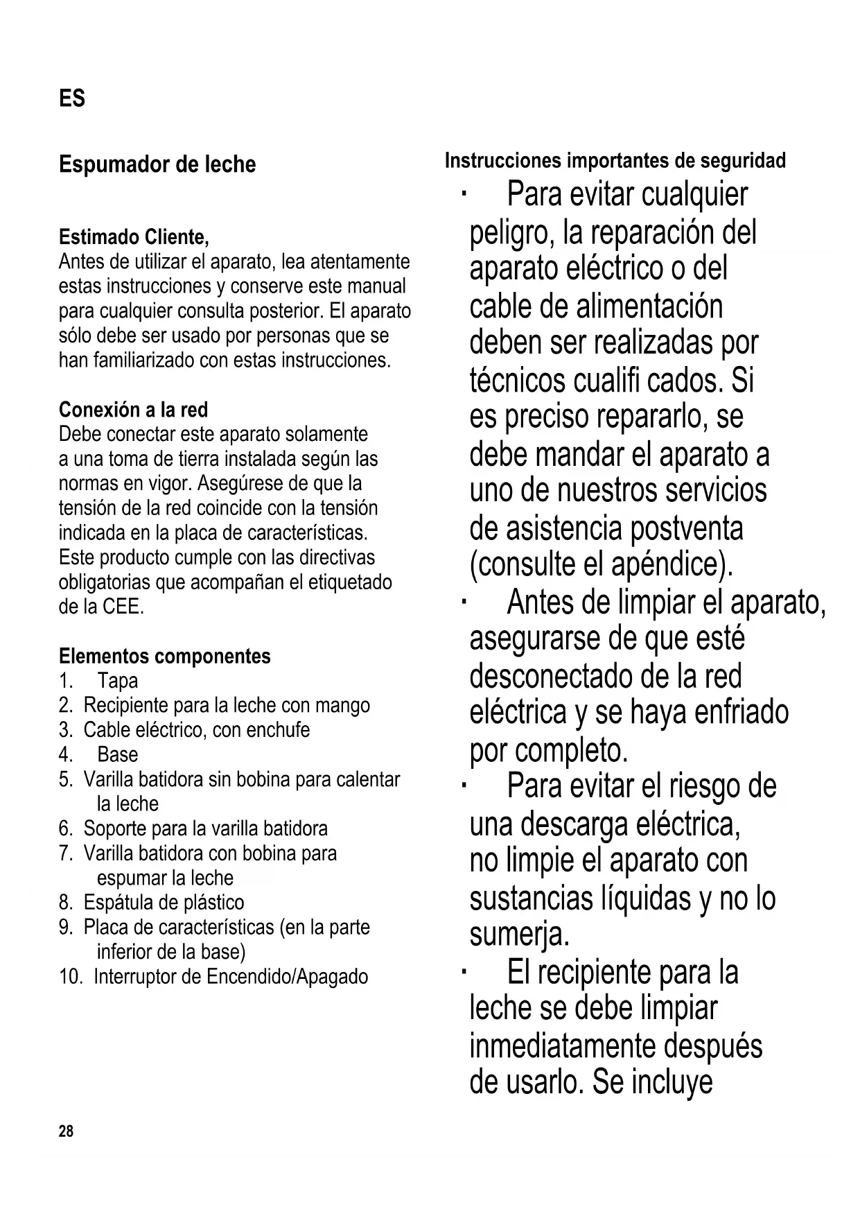 Instrucciones importantes de seguridad ∙ Para evitar cualquier peligro, la reparación del aparato eléctrico o del cable de alimentación deben ser realizadas por técnicos cualifi cados. Si es preciso repararlo, se debe mandar el aparato a uno de nuestros servicios de asistencia postventa (consulte el apéndice). ∙ Antes de limpiar el aparato, asegurarse de que esté desconectado de la red eléctrica y se haya enfriado por completo. ∙ Para evitar el riesgo de una descarga eléctrica, no limpie el aparato con sustancias líquidas y no lo sumerja. ∙ El recipiente para la leche se debe limpiar inmediatamente después de usarlo. Se incluye ES29 información detallada sobre la limpieza en la sección Limpieza y mantenimiento. ∙ El espumador de leche sólo debe utilizarse sobre la base correspondiente. ∙ Las conexiones eléctricas de la base se deben proteger siempre para evitar su contacto con agua. ∙ Utilice siempre el mango del recipiente para la leche, porque podría estar caliente durante y después del funcionamiento. ∙ Precaución: El uso incorrecto puede provocar lesiones personales graves. ∙ Este aparato ha sido diseñado para el uso doméstico u otra aplicación similar, por ejemplo - en cocinas de personal, en ofi cinas y otros puntos comerciales, - en empresas agrícolas, - por los clientes de hoteles, pensiones, etc. y alojamientos similares, - en casas rurales. ∙ Este aparato podrá ser utilizado por niños (mayores de 8 años) y personas con reducidas facultades físicas, sensoriales o mentales, o sin experiencia ni conocimiento del producto, siempre que hayan recibido la supervisión o instrucciones referentes al uso del aparato y entiendan por completo el peligro y las precauciones de seguridad. ∙ Los niños no deben jugar con el aparato. ∙ No se debe permitir que los niños realicen ningún trabajo de limpieza o mantenimiento del aparato a menos que estén bajo vigilancia y tengan más de 8 años.30 ∙ El aparato y su cable eléctrico siempre se deben mantener fuera del alcance de niños menores de 8 años. ∙ Precaución: Mantenga a los niños alejados del material de embalaje, porque podría ser peligroso, existe el peligro de asfi xia. ∙ Antes de utilizar el aparato, siempre se debe comprobar que tanto la unidad principal, el cable de alimentación como cualquier accesorio no están defectuosos. En caso de que el aparato haya caído sobre una superfi cie dura, o se haya tirado en exceso del cable de alimentación, no se deberá utilizar de nuevo: incluso los desperfectos no visibles pueden tener efectos adversos sobre la seguridad en el uso del aparato. ∙ Este aparato ha sido diseñado exclusivamente para calentar y espumar leche. No introduzca ningún otro tipo de líquido o alimento sólido en el recipiente. ∙ No deje el espumador de leche funcionando sin supervisión. ∙ Respete siempre las señales de nivel máximo del interior del recipiente en cada utilización. Si no existe sufi ciente leche, el aparato se podría sobrecalentar. ∙ Para evitar el sobrecalentamiento, el aparato se apagará automáticamente si se intenta poner en funcionamiento vacío. En caso de que esto ocurra, el indicador se apagará. Desenchufe el cable eléctrico y espere hasta que el aparato se haya enfriado. ∙ Precaución: Llenar excesivamente el recipiente puede ser peligroso porque la leche espumada podría rebosar. ∙ Precaución: La tapa siempre debe estar cerrada durante el funcionamiento del aparato; solo se debe abrir para añadir cacao en polvo u otro ingrediente similar. ∙ El aparato solo se debe utilizar con los accesorios originales suministrados por el fabricante. ∙ El aparato siempre se debe montar sobre una superfi cie plana y fi rme. ∙ No deje que la carcasa ni el cable entren en contacto con llamas ni con ninguna superfi cie caliente tales como platos muy calientes. ∙ No permita que el cable eléctrico cuelgue suelto; se debe mantener el cable sufi cientemente alejado de las partes calientes del aparato. ∙ Desenchufe siempre el aparato - si hay una avería, - después del uso, y - antes de limpiarlo. ∙ Cuando se desenchufa la clavija de la pared, nunca tirar del cable de alimentación. ∙ No se acepta responsabilidad alguna si hay averías a consecuencia del uso incorrecto del aparato o si estas instrucciones no han sido observadas debidamente.31 Antes de usarlo por primera vez Retire todo el material de embalaje y compruebe que tiene todos los componentes. Antes de utilizar el aparato por vez primera, o tras largos períodos de no utilización, se debe limpiar meticulosamente como viene indicado en la sección Limpieza y mantenimiento. Funcionamiento ∙ Se recomienda utilizar leche de alto contenido proteico. Para obtener mejores resultados, se debe sacar la leche del frigorífi co inmediatamente antes de espumarla. ∙ Compruebe siempre que la superfi cie de contacto entre la base y el recipiente para la leche está limpia y seca. Selección de la varilla batidora ∙ Para espumar la leche, instale la varilla batidora con bobina en el eje del soporte, con la cara plana hacia abajo. ∙ Si solo desea calentar la leche, coloque la varilla batidora, sin la bobina, en el eje del soporte, con la cara plana hacia abajo. ∙ El aro de goma se debe colocar en el soporte durante el funcionamiento. No utilice el aparato sin el aro de goma. Nivel de llenado ∙ Para espumar leche, llene el recipiente con un máximo de 150 ml (señal inferior de nivel máx). ∙ Para calentar leche, llene el recipiente con un máximo de 300 ml (señal superior de nivel máx ). Calentar y espumar la leche ∙ Conecte el aparato a la red eléctrica. ∙ Coloque el recipiente sobre la base. ∙ Retire la tapa del recipiente para la leche. ∙ Acople la varilla batidora 'Espumadora' (con bobina) en el eje y coloque la pieza (correctamente centrada) en el recipiente para la leche. ∙ Precaución: Si no está correctamente centrado, el soporte puede provoca