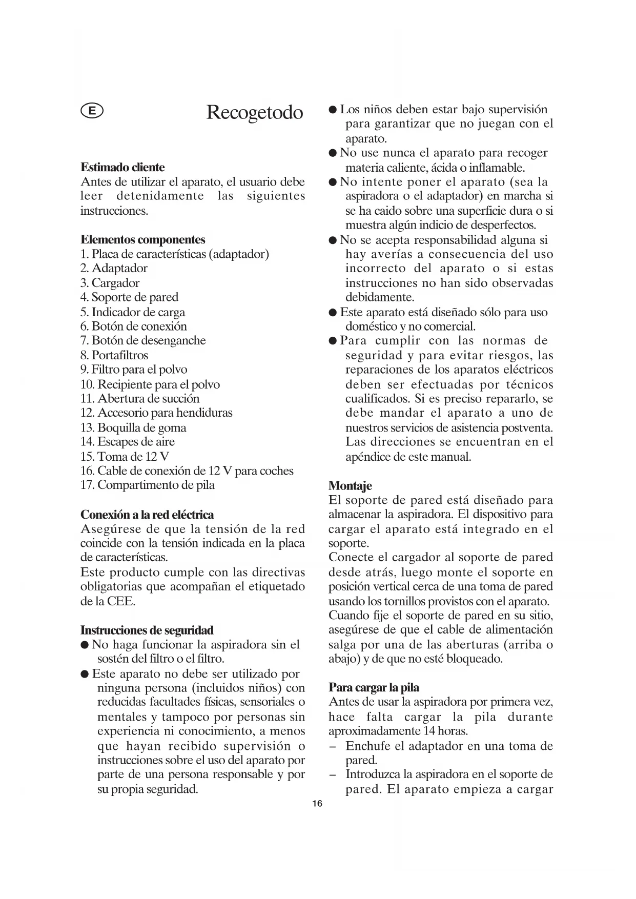 Conexión a la red eléctrica Asegúrese de que la tensión de la red coincide con la tensión indicada en la placa de características. Este producto cumple con las directivas obligatorias que acompañan el etiquetado de la CEE. Instrucciones de seguridad ● No haga funcionar la aspiradora sin el sostén del filtro o el filtro. ● Este aparato no debe ser utilizado por ninguna persona (incluidos niños) con reducidas facultades físicas, sensoriales o mentales y tampoco por personas sin experiencia ni conocimiento, a menos que hayan recibido supervisión o instrucciones sobre el uso del aparato por parte de una persona responsable y por su propia seguridad. ● Los niños deben estar bajo supervisión para garantizar que no juegan con el aparato. ● No use nunca el aparato para recoger materia caliente, ácida o inflamable. ● No intente poner el aparato (sea la aspiradora o el adaptador) en marcha si se ha caido sobre una superficie dura o si muestra algún indicio de desperfectos. ● No se acepta responsabilidad alguna si hay averías a consecuencia del uso incorrecto del aparato o si estas instrucciones no han sido observadas debidamente. ● Este aparato está diseñado sólo para uso doméstico y no comercial. ● Para cumplir con las normas de seguridad y para evitar riesgos, las reparaciones de los aparatos eléctricos deben ser efectuadas por técnicos cualificados. Si es preciso repararlo, se debe mandar el aparato a uno de nuestros servicios de asistencia postventa. Las direcciones se encuentran en el apéndice de este manual. Montaje El soporte de pared está diseñado para almacenar la aspiradora. El dispositivo para cargar el aparato está integrado en el soporte. Conecte el cargador al soporte de pared desde atrás, luego monte el soporte en posición vertical cerca de una toma de pared usando los tornillos provistos con el aparato. Cuando fije el soporte de pared en su sitio, asegúrese de que el cable de alimentación salga por una de las aberturas (arriba o abajo) y de que no esté bloqueado. Para cargar la pila Antes de usar la aspiradora por primera vez, hace falta cargar la pila durante aproximadamente 14 horas.