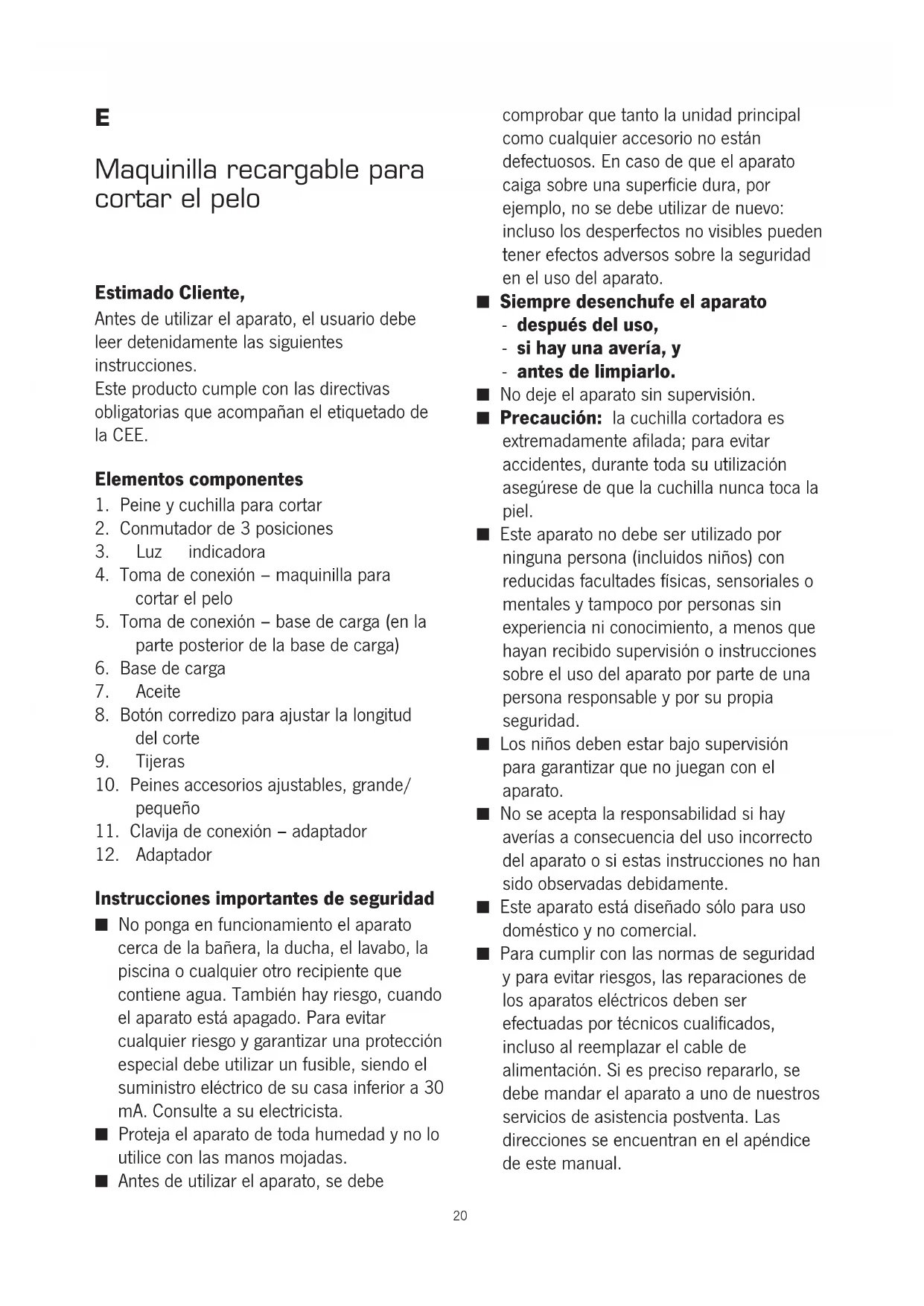 Instrucciones importantes de seguridad ■ No ponga en funcionamiento el aparato cerca de la bañera, la ducha, el lavabo, la piscina o cualquier otro recipiente que contiene agua. También hay riesgo, cuando el aparato está apagado. Para evitar cualquier riesgo y garantizar una protección especial debe utilizar un fusible, siendo el suministro eléctrico de su casa inferior a 30 mA. Consulte a su electricista. ■ Proteja el aparato de toda humedad y no lo utilice con las manos mojadas. ■ Antes de utilizar el aparato, se debe comprobar que tanto la unidad principal como cualquier accesorio no están defectuosos. En caso de que el aparato caiga sobre una superficie dura, por ejemplo, no se debe utilizar de nuevo: incluso los desperfectos no visibles pueden tener efectos adversos sobre la seguridad en el uso del aparato. ■ Siempre desenchufe el aparato - después del uso, - si hay una avería, y - antes de limpiarlo. ■ No deje el aparato sin supervisión. ■ Precaución: la cuchilla cortadora es extremadamente afilada; para evitar accidentes, durante toda su utilización asegúrese de que la cuchilla nunca toca la piel. ■ Este aparato no debe ser utilizado por ninguna persona (incluidos niños) con reducidas facultades físicas, sensoriales o mentales y tampoco por personas sin experiencia ni conocimiento, a menos que hayan recibido supervisión o instrucciones sobre el uso del aparato por parte de una persona responsable y por su propia seguridad. ■ Los niños deben estar bajo supervisión para garantizar que no juegan con el aparato. ■ No se acepta la responsabilidad si hay averías a consecuencia del uso incorrecto del aparato o si estas instrucciones no han sido observadas debidamente. ■ Este aparato está diseñado sólo para uso doméstico y no comercial. ■ Para cumplir con las normas de seguridad y para evitar riesgos, las reparaciones de los aparatos eléctricos deben ser efectuadas por técnicos cualificados, incluso al reemplazar el cable de alimentación. Si es preciso repararlo, se debe mandar el aparato a uno de nuestros servicios de asistencia postventa. Las direcciones se encuentran en el apéndice de este manual. 20Conexión a la red eléctrica Asegúrese de que la tensión de la red coincide con la tensión indicada en la placa de características en el adaptador. El proceso de carga Antes de usar la maquinilla para cortar el pelo por primera vez, hay que cargar la pila por completo durante un período de aproximadamente 10 horas. No obstante, se puede dejar el aparato cargando más tiempo sin daño o peligro alguno. Si observa que la potencia de la maquinilla disminuye considerablemente, o si la luz indicadora comienza a parpadear en rojo, apague la maquinilla y recargue la batería. La maquinilla para cortar el pelo también se puede utilizar mediante el adaptador. Sin embargo, en este caso es necesario cargar la pila brevemente durante aproximadamente 10 minutos. El proceso de carga se inicia sólo cuando el aparato está apagado y se observará mediante el indicador de carga.