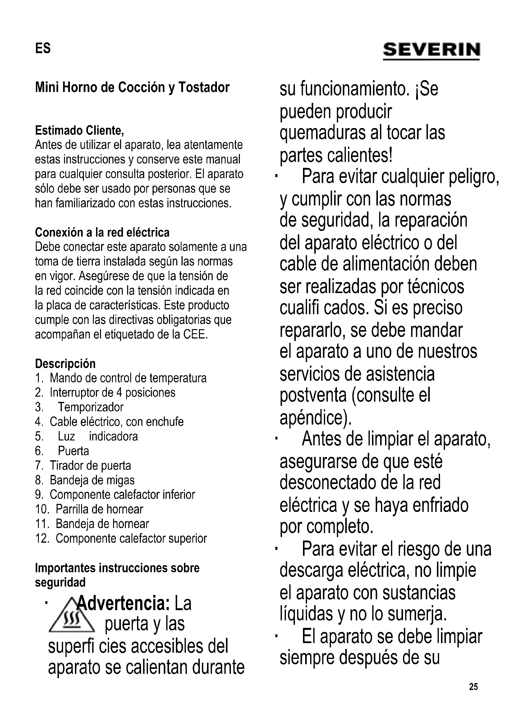 Importantes instrucciones sobre seguridad ∙ Advertencia: La puerta y las superfi cies accesibles del aparato se calientan durante su funcionamiento. ¡Se pueden producir quemaduras al tocar las partes calientes! ∙ Para evitar cualquier peligro, y cumplir con las normas de seguridad, la reparación del aparato eléctrico o del cable de alimentación deben ser realizadas por técnicos cualifi cados. Si es preciso repararlo, se debe mandar el aparato a uno de nuestros servicios de asistencia postventa (consulte el apéndice). ∙ Antes de limpiar el aparato, asegurarse de que esté desconectado de la red eléctrica y se haya enfriado por completo. ∙ Para evitar el riesgo de una descarga eléctrica, no limpie el aparato con sustancias líquidas y no lo sumerja. ∙ El aparato se debe limpiar siempre después de su ES26 utilización. Para tener información detallada, consulte la sección Limpieza y mantenimiento. ∙ El aparato no debe ser utilizado con un temporizador externo ni un sistema de mando a distancia. ∙ Este aparato ha sido diseñado para el uso doméstico u otra aplicación similar, por ejemplo - en cocinas de personal, en ofi cinas y otros puntos comerciales, - en empresas agrícolas, - por los clientes de hoteles, pensiones, etc. y alojamientos similares, - en casas rurales. ∙ Este aparato podrá ser utilizado por niños (mayores de 8 años) y personas con reducidas facultades físicas, sensoriales o mentales, o sin experiencia ni conocimiento del producto, siempre que hayan recibido la supervisión o instrucciones referentes al uso del aparato y entiendan por completo el peligro y las precauciones de seguridad. ∙ Los niños no deben jugar con el aparato. ∙ No se debe permitir que los niños realicen ningún trabajo de limpieza o mantenimiento del aparato a menos que esté bajo vigilancia y tengan más de 8 años. ∙ El aparato y su cable eléctrico siempre se deben mantener fuera del alcance de niños menores de 8 años. ∙ Precaución: Mantenga a los niños alejados del material de embalaje, porque podría ser peligroso, existe el peligro de asfi xia. ∙ Antes de utilizar el aparato, siempre se debe comprobar que tanto la unidad principal, el cable de alimentación como cualquier accesorio no están defectuosos. En caso de que el aparato haya caído sobre una superfi cie dura, o se haya tirado en exceso del cable27 de alimentación, no se deberá utilizar de nuevo: incluso los desperfectos no visibles pueden tener efectos adversos sobre la seguridad en el uso del aparato. ∙ No toque los elementos calefactores. ∙ Antes de utilizar este aparato, debe instalarse la bandeja de migas en la posición correcta debajo del elemento calefactor inferior. ∙ El aceite o la grasa calentados en exceso pueden incendiarse. Por lo tanto no llene en exceso la bandeja de hornear; de este modo evitará que la grasa gotee y caiga sobre el elemento calefactor inferior. ∙ Durante su utilización, la bandeja de hornear siempre se debe colocar en la parrilla de hornear. ∙ No permita que ningún objeto afi lado o abrasivo esté en contacto con la bandeja de hornear durante su utilización o limpieza. ∙ No deje el aparato sin vigilancia durante su funcionamiento. ∙ No utilizar el aparato en el exterior. ∙ Debe asegurar una ventilación sufi ciente en todo momento. No coloque objetos encima de la unidad, y asegúrese de que se respeten las siguientes distancias mínimas de una pared u otro objeto: Lado: 12 cm Posterior: 12 cm Superior: 30 cm ∙ No debe instalarse este aparato dentro de un armario; al colocar el aparato, asegúrese también de no situarlo inmediatamente debajo de un armario o de cualquier otro objeto similar. ∙ No debe quitarle los pies que se encuentran en la base de la unidad. ∙ No utilice ni coloque este aparato cerca de objetos tales como cortinas o materiales infl amables. ∙ Cuando el aparato esté funcionando debe colocarse sobre una superfi cie resistente al calor. No coloque el aparato sobre o cerca de superfi cies calientes tales como resistencias eléctricas, ni próximo a una salida de gas u otras fuentes de calor. ∙ No deje que el cable de alimentación entre en contacto con ninguna parte del aparato que esté caliente. ∙ No permita que el cable de conexión cuelgue libremente. ∙ Desenchufe siempre el aparato - después del uso, - si hay una avería, y - antes de limpiarlo. ∙ Para desenchufar, no tire nunca del cable; agarre la clavija. ∙ No se acepta la responsabilidad si hay averías a consecuencia del uso incorrecto del aparato o si estas instrucciones no han sido observadas debidamente. Mando de control de temperatura El mando de control de la temperatura se utiliza para seleccionar el nivel de temperatura deseado. Las 4 posiciones del interruptor Los dos calentadores están apagados Calentador superior Calentador inferior Calentador superior e inferior Los dos calentadores se encenderán solo cuando se active el temporizador. Temporizador ∙ Con ayuda del temporizador podemos seleccionar el tiempo de elaboración de los alimentos (máximo 60 minutos).28 ∙ Si desea programar un tiempo de funcionamiento, gire el botón del temporizador en el sentido de las agujas del reloj hasta el valor deseado. ∙ Si desea seleccionar una duración inferior a 10 minutos, gire primero el temporizador a un ajuste superior y después gírelo lentamente hasta el ajuste de tiempo deseado. Cuando el tiempo programado ha llegado a su fi nal, una señal acústica indicará que el horno se ha apagado. Luz indicadora La luz indicadora se enciende cuando el aparato está funcionando. La luz se apaga cuando el tiempo programado ha transcurrido, o volviendo a colocar el interruptor en la posición