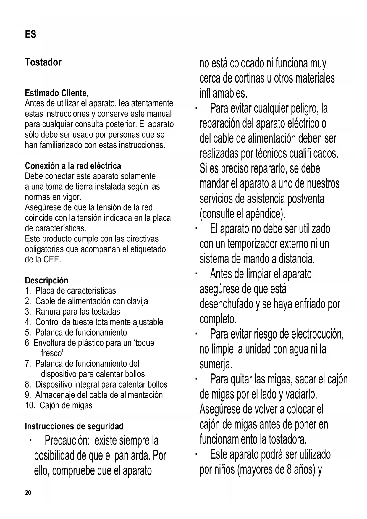 Instrucciones de seguridad ∙ Precaución: existe siempre la posibilidad de que el pan arda. Por ello, compruebe que el aparato no está colocado ni funciona muy cerca de cortinas u otros materiales infl amables. ∙ Para evitar cualquier peligro, la reparación del aparato eléctrico o del cable de alimentación deben ser realizadas por técnicos cualifi cados. Si es preciso repararlo, se debe mandar el aparato a uno de nuestros servicios de asistencia postventa (consulte el apéndice). ∙ El aparato no debe ser utilizado con un temporizador externo ni un sistema de mando a distancia. ∙ Antes de limpiar el aparato, asegúrese de que está desenchufado y se haya enfriado por completo. ∙ Para evitar riesgo de electrocución, no limpie la unidad con agua ni la sumerja. ∙ Para quitar las migas, sacar el cajón de migas por el lado y vaciarlo. Asegúrese de volver a colocar el cajón de migas antes de poner en funcionamiento la tostadora. ∙ Este aparato podrá ser utilizado por niños (mayores de 8 años) y ES21 personas con reducidas facultades físicas, sensoriales o mentales, o sin experiencia ni conocimiento del producto, siempre que hayan recibido la supervisión o instrucciones referentes al uso del aparato y entiendan por completo el peligro y las precauciones de seguridad. ∙ Los niños no deben jugar con el aparato. ∙ No se debe permitir que los niños realicen ningún trabajo de limpieza o mantenimiento del aparato a menos que esté bajo vigilancia y tengan más de 8 años. ∙ El aparato y su cable eléctrico siempre se deben mantener fuera del alcance de niños menores de 8 años. ∙ Precaución: mantenga a los niños alejados del material de embalaje, porque podría ser peligroso, existe el peligro de asfi xia. ∙ Coloque siempre el aparato sobre una superfi cie nivelada y termorresistente. ∙ Para proteger la carcasa, no coloque el aparato encima o cerca de superfi cies calientes o llamas, como por ejemplo placas calientes o llamas de gas. ∙ Precaución: la superfi cie accesible de la carcasa alcanza temperaturas muy altas durante su funcionamiento. : El contacto con las partes calientes de este aparato puede ocasionar quemaduras graves. ∙ Antes de utilizar el aparato, siempre se debe comprobar que tanto la unidad principal, el cable de alimentación como cualquier accesorio no están defectuosos. En caso de que el aparato haya caído sobre una superfi cie dura, o se haya tirado en exceso del cable de alimentación, no se deberá utilizar de nuevo: incluso los desperfectos no visibles pueden tener efectos adversos sobre la seguridad en el uso del aparato. ∙ Nunca deje que el cable toque superfícies calientes. ∙ No deje el cable colgando. ∙ No deje el aparato sin vigilar durante su funcionamiento. ∙ No cubra la ranura de tostado durante el funcionamiento. ∙ No intente sacar el pan del tostador con los dedos ni introduzca otros objetos (p. ej. cuchillos, tenedores) en la ranura para las tostadas. Los elementos incandescentes transmiten corriente eléctrica. ∙ Apague y desenchufe siempre el aparato - después del uso, - si hay una avería, y - antes de limpiarlo. ∙ Cuando se desenchufa la clavija de la pared, nunca tirar del cable de alimentación; sino asir siempre la clavija misma. ∙ No se acepta responsabilidad alguna si hay averías a consecuencia del uso incorrecto del aparato o si estas instrucciones no han sido observadas debidamente. ∙ Este aparato ha sido diseñado para el22 uso doméstico u otra aplicación similar, por ejemplo - en ofi cinas y otros puntos comerciales, - en empresas agrícolas, - por los clientes de hoteles, pensiones, etc. y establecimientos similares, - en casas rurales. Funcionamiento Información general ∙ Atención: la palanca de funcionamiento sólo se traba cuando el cable eléctrico está enchufado. ∙ No introducir rebanadas demasiado gruesas o grandes ya que pueden quedarse atascadas en el tostador. El grosor de las rebanadas no debe exceder los 14 mm. ∙ Si ocurren problemas o averías y antes de la limpieza, desenchufar siempre la clavija de la pared. ∙ Para sacar una rebanada atascada en la ranura, usar un palo de madera embotado (p. ej. el puño de un cepillo). No tocar nunca los elementos térmicos de metal. Antes de emplearlo por primera vez ∙ Limpiar el tostador a fondo (referirse a Mantenimiento y limpieza general). ∙ Encender el tostador sin introducir pan y dejar que acaben al menos cinco ciclos de tostado a la temperatura máxima. ∙ Dejar que el tostador se enfríe entre los ciclos de tostado. ∙ Cuando se encienda el aparato por primera vez, puede que la tostadora emita un leve olor y un poco de humo. Por este motivo, se debe asegurar una ventilación adecuada abriendo las ventanas o el balcón. Ajustar el nivel de tostado El nivel de tostado deseado es totalmente ajustable con el control de tostado. Ligero: girar el botón de control en el sentido contrario al de las agujas del reloj. Oscuro: girar el botón de control en la dirección de las agujas del reloj. En el caso de rebanadas de pan específi camente destinadas para tostadas, recomendamos un ajuste de 3 a 4 en el nivel de tostado. Funcionamiento ∙ Después de ajustar el control de tueste, introduzca el pan en la ranura para las tostadas y empuje la palanca de funcionamiento hacia abajo. ∙ Una vez que se haya tostado el pan al punto deseado, el tostador se apaga automáticamente y las rebanadas son expulsadas y se pueden sacar. ∙ Para mantener un nivel regular de tostado al tostar varias rebanadas una tras otra, dejar que el tostador se enfríe durante unos 60-90 segundos después de cada ciclo. ∙ No cubrir la ranura de tostado durante la operación. Interrumpir el ciclo de tostado Si desea interrumpir el ciclo de tueste, empuje la palanca de funcionamiento hacia arriba. Calentar bollos, panecillos etc. ∙ Para calentar bollos, panecillos u otros productos semejantes, deslice el control corredizo hacia la ranura p