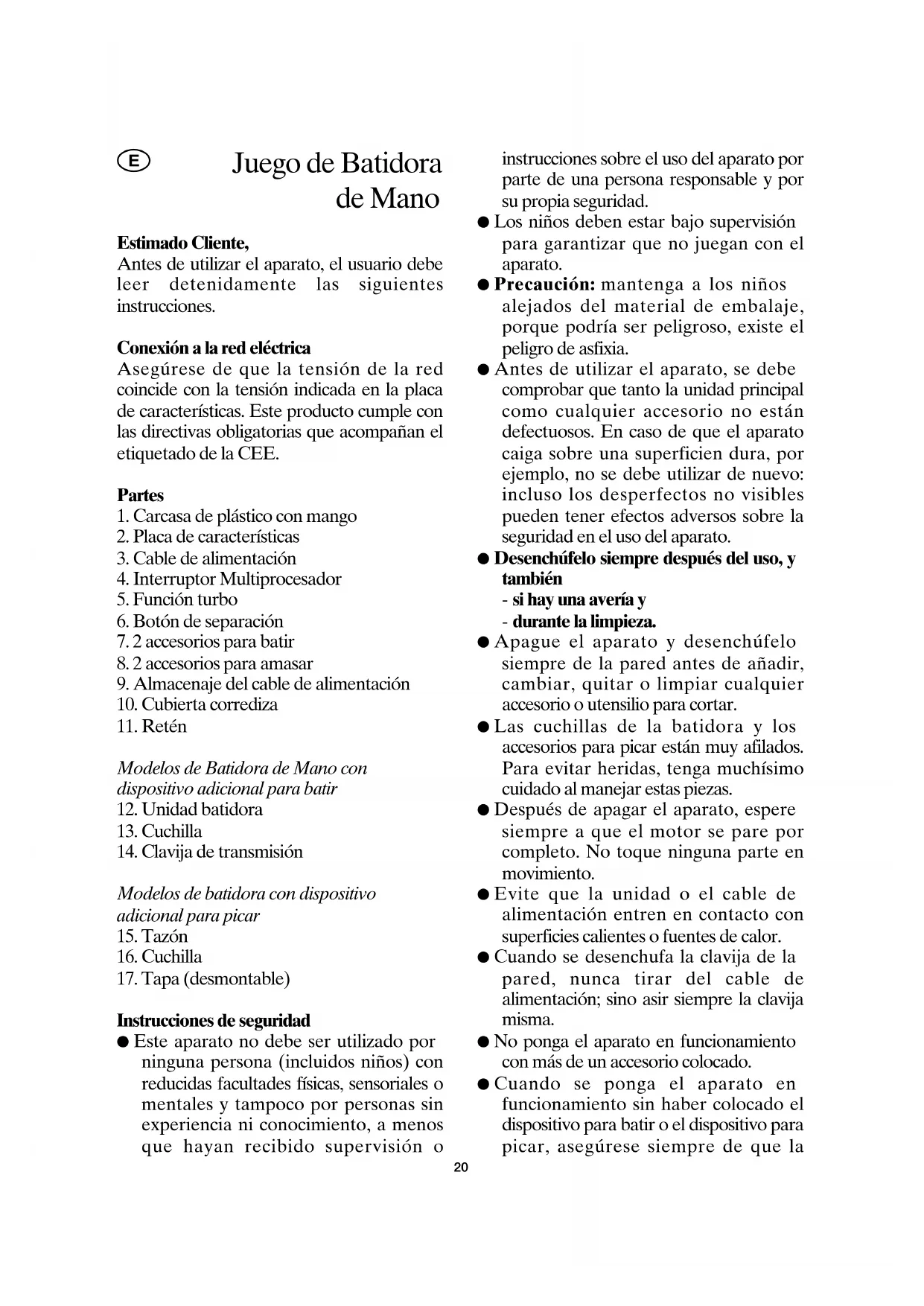 Las cuchillas de la batidora y los accesos para picar estar muy aflilados. Para evaporar heridas,onga muchiso cuidado al manejar estas piezas. - Después de apagar el aparato, espere siempre a que el motor separe por completeness. No toque ninguna parte en movimiento.