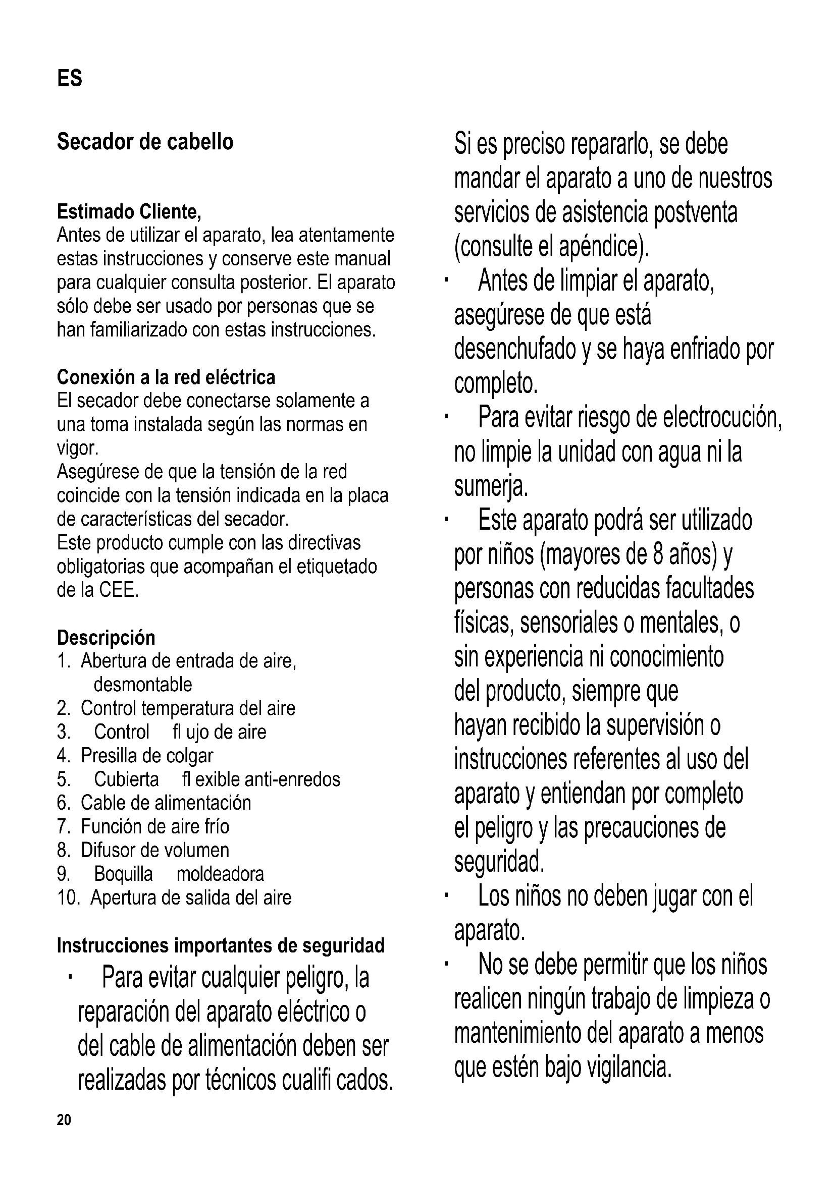Instrucciones importantes de seguridad ∙ Para evitar cualquier peligro, la reparación del aparato eléctrico o del cable de alimentación deben ser realizadas por técnicos cualifi cados. Si es preciso repararlo, se debe mandar el aparato a uno de nuestros servicios de asistencia postventa (consulte el apéndice). ∙ Antes de limpiar el aparato, asegúrese de que está desenchufado y se haya enfriado por completo. ∙ Para evitar riesgo de electrocución, no limpie la unidad con agua ni la sumerja. ∙ Este aparato podrá ser utilizado por niños (mayores de 8 años) y personas con reducidas facultades físicas, sensoriales o mentales, o sin experiencia ni conocimiento del producto, siempre que hayan recibido la supervisión o instrucciones referentes al uso del aparato y entiendan por completo el peligro y las precauciones de seguridad. ∙ Los niños no deben jugar con el aparato. ∙ No se debe permitir que los niños realicen ningún trabajo de limpieza o mantenimiento del aparato a menos que estén bajo vigilancia. ES21 ∙ Atención: no ponga el aparato en funcionamiento cerca de una bañera, un lavabo u otro recipiente con agua. ∙ Cerca del agua, también existe riesgo incluso cuando el aparato está desconectado. Por lo tanto desenchufe siempre el cable eléctrico de la toma de la pared después de su utilización, si está usando el aparato en el cuarto de baño. ∙ Se puede conseguir protección adicional añadiendo a la instalación de su hogar un cortacircuitos con fi ltración a tierra con una corriente de disparo clasifi cada que no exceda los 30mA (IF < 30mA). Por favor consulte con un electricista cualifi cado. ∙ Precaución: mantenga a los niños alejados del material de embalaje, porque podría ser peligroso, existe el peligro de asfi xia. ∙ Proteja el aparato de toda humedad y no lo utilice con las manos mojadas. ∙ Los aparatos eléctricos de calefacción funcionan a temperaturas muy elevadas. No toque ninguna parte del aparato excepto la empuñadura. Tocar las partes calientes puede producir quemaduras. Cuando maneja el secador, cójalo sólo por la empuñadura. ∙ No utilice el aparato con postizos sintéticos ni con pelucas. El calor emitido puede dañar las fi bras sintéticas. ∙ Asegúrese de que las aberturas de entrada y salida de aire no queden obstruidas con dedos o con cabello y que no se acumulen cabellos en la entrada del aire. ∙ Una obstrucción en el sistema de expulsión de aire podría activar el sistema integral de desconexión térmica de seguridad y apagar el aparato. Si esto ocurriese, desconecte inmediatamente el aparato de la toma eléctrica y permita que se enfríe durante sufi ciente tiempo antes de eliminar la obstrucción y volver a encender el aparato. ∙ Antes de utilizar el aparato, se debe comprobar que tanto la unidad principal como cualquier accesorio no están defectuosos. En caso de que el aparato haya caído sobre una superfi cie dura, o se haya tirado en exceso del cable de alimentación, no se deberá utilizar de nuevo: En caso de que el aparato caiga sobre una superfi cie dura, por ejemplo, no se debe utilizar de nuevo: incluso los desperfectos no visibles pueden tener efectos adversos sobre la seguridad en el uso del aparato. ∙ Para evitar dañar el cable eléctrico, - no doble ni retuerza el cable, especialmente en la posición de salida de la carcasa, - no estire del cable, - no enrolle el cable alrededor del aparato. ∙ No deje el aparato sin vigilar durante su funcionamiento. ∙ Apague el aparato y desenchufe el22 cable de alimentación, cuando fi nalice de utilizarlo, y también en caso de que no funcione correctamente. ∙ Cuando se desenchufa la clavija de la pared, nunca tirar del cable de alimentación. ∙ No coloque el aparato encima de superfi cies sensibles al calor durante o inmediatamente después del uso. ∙ No se acepta responsabilidad alguna si hay averías a consecuencia del uso incorrecto del aparato o si estas instrucciones no han sido observadas debidamente. ∙ Este aparato ha sido diseñado para el uso doméstico u otra aplicación similar, por ejemplo - en ofi cinas y otros puntos comerciales, - en empresas agrícolas, - por los clientes de hoteles, pensiones, etc. y establecimientos similares, - en casas rurales. La función IÓNICA La función IÓNICA facilita el moldeado suave y fácil del cabello evitando la formación de carga estática en el cabello. Utilice la acumulación de una ‘nube de iones’ negativos para evitar que el cabello ‘vuele’ debido a una carga positiva. La función IÓNICA se activa automáticamente; su efecto está reforzado por la rejilla con recubrimiento cerámico de la salida de aire Boquilla moldeadora La boquilla moldeadora se puede colocar en la salida de aire para facilitar el moldeado del cabello mientras se seca. Difusor de volumen El difusor de volumen también se debe acoplar en la salida de aire. El difusor de volumen permite mantener el volumen y el aspecto natural del pelo rizado. Mueva el difusor de volumen alrededor de la cabeza con un movimiento circular. Control del fl ujo de aire y la temperatura Utilizando distintas combinaciones de ajuste del fl ujo de aire y la temperatura, se conseguirán distintos resultados al secar el cabello. El control de fl ujo de aire regula la intensidad del fl ujo de aire, mientras que el control de la temperatura regula el calor del fl ujo de aire. Cuando el control de fl ujo de aire esté en la posición ‘0’, el secador estará apagado. Función de aire frío La función de aire frío se puede utilizar en cualquier momento durante el proceso de secado del cabello. Proporcionará aire más frío, que contribuirá a reafi rmar y moldear el peinado. Funcionamiento Enchufe el secador de cabello a una toma de pared adecuada y seleccione el ajuste de potencia deseado mediante los interruptores incorporados en el mango. Limpieza y mantenimiento ∙ Antes de limpiar el secador, desenchúfelo y déjelo que